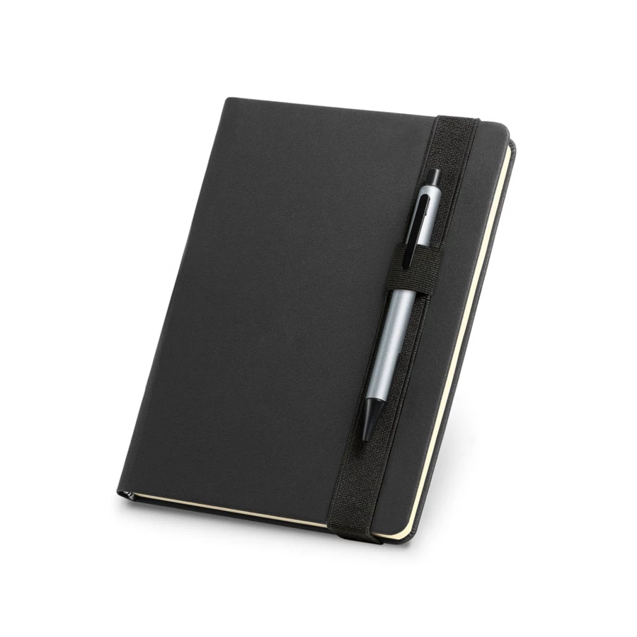 Notes A5 z twardą okładką z PU. Posiada 280 gładkich stro,wykonany z materiałów z certyfikatem FSC™ i innych kontrolowanych materiałów, n w kolorze kości słoniowej, uchwyt na długopis (nie jest dołączony) i gumkę. Dostarczany w etui z materiału non-woven. 145 x 210 mm | Etui: 185 x 240 mm