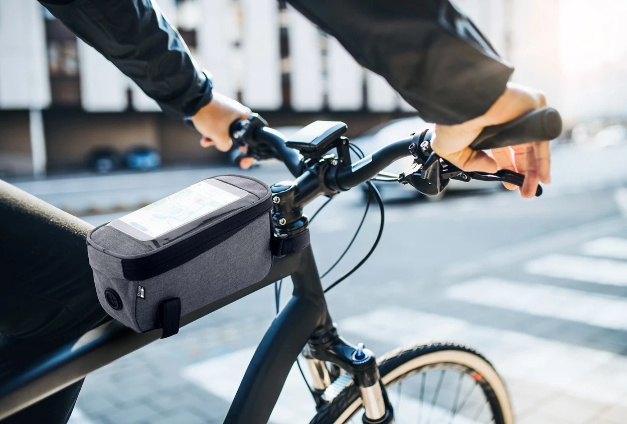 Wyściełana, zapinana na zamek torba rowerowa na ramę, wykonana z poliestru 600D RPET, z regulowanymi paskami na rzepy i kieszenią na telefon z ekranem dotykowym. Z charakterystyczną metką RPET.