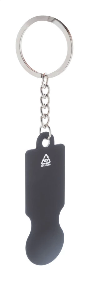 Brelok ze stali nierdzewnej z recyklingu z gumowanym wykończeniem i żetonem do wózka sklepowego. Ze specjalną powłoką pod grawer lustrzany.