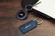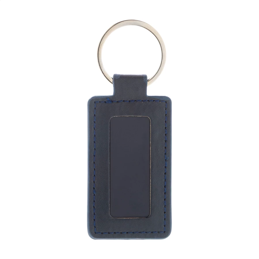 Prostokątny brelok z recyklingowanej skóry PU z metalowym kółkiem i stalową płytką z logo, z gumowanym wykończeniem. Ze specjalną powłoką do lustrzanego grawerowania laserowego.