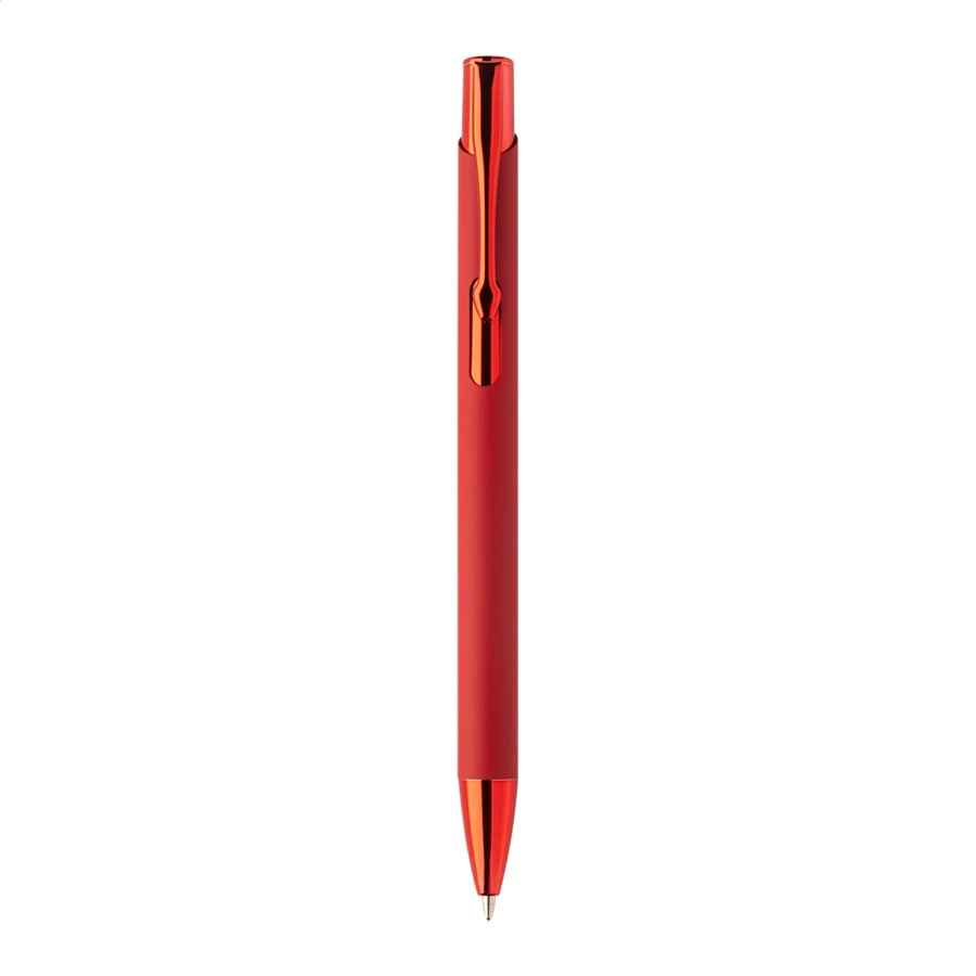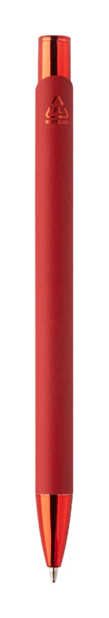 Długopis z recyklingowanego aluminium z gumowaną obudową i kolorowymi, błyszczącymi, metalowymi elementami. Ze specjalną powłoką do lustrzanego grawerowania, pasującą do metalowych elementów. Z niebieskim wkładem.
