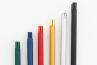 Długopis z recyklingowanego aluminium z gumowaną obudową i kolorowymi, błyszczącymi, metalowymi elementami. Ze specjalną powłoką do lustrzanego grawerowania, pasującą do metalowych elementów. Z niebieskim wkładem.