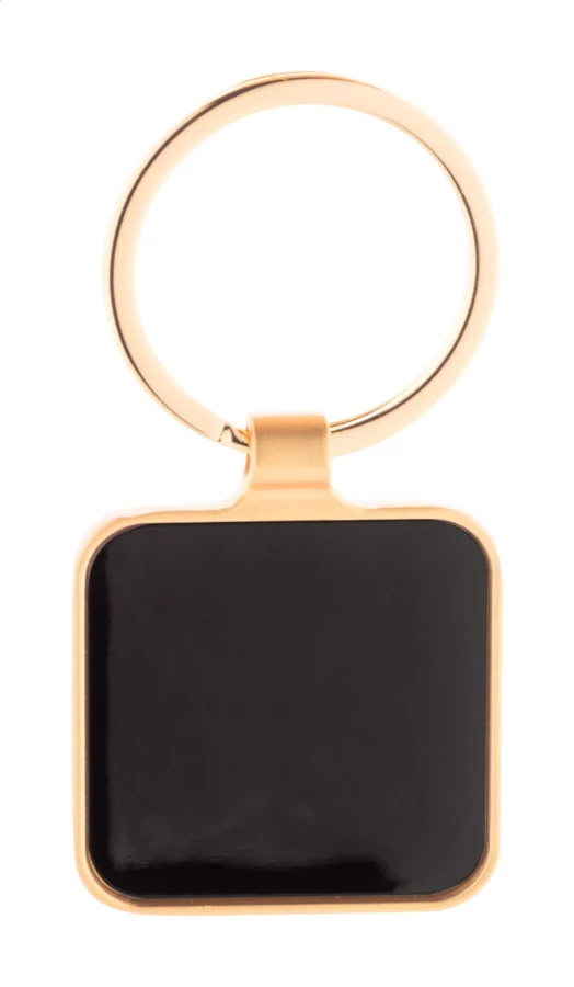 Kwadratowy metalowy brelok do kluczy w złotym wykończeniu z brązową płytką. W pudełku z papieru kraft.