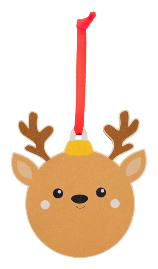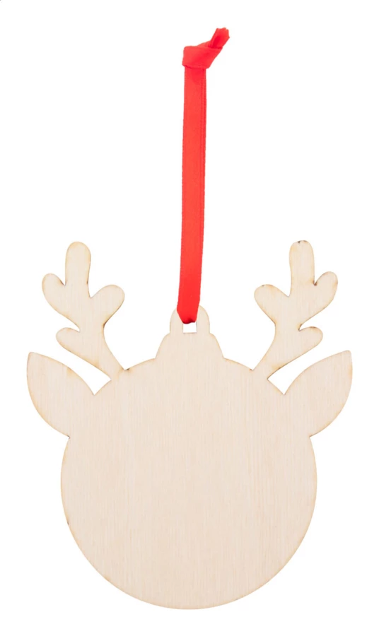 Drewniana ozdoba choinkowa ze sklejki brzozowej, z nadrukowanym motywem świątecznym i czerwoną wstążką. Dostarczana z odpiętą tasiemką.