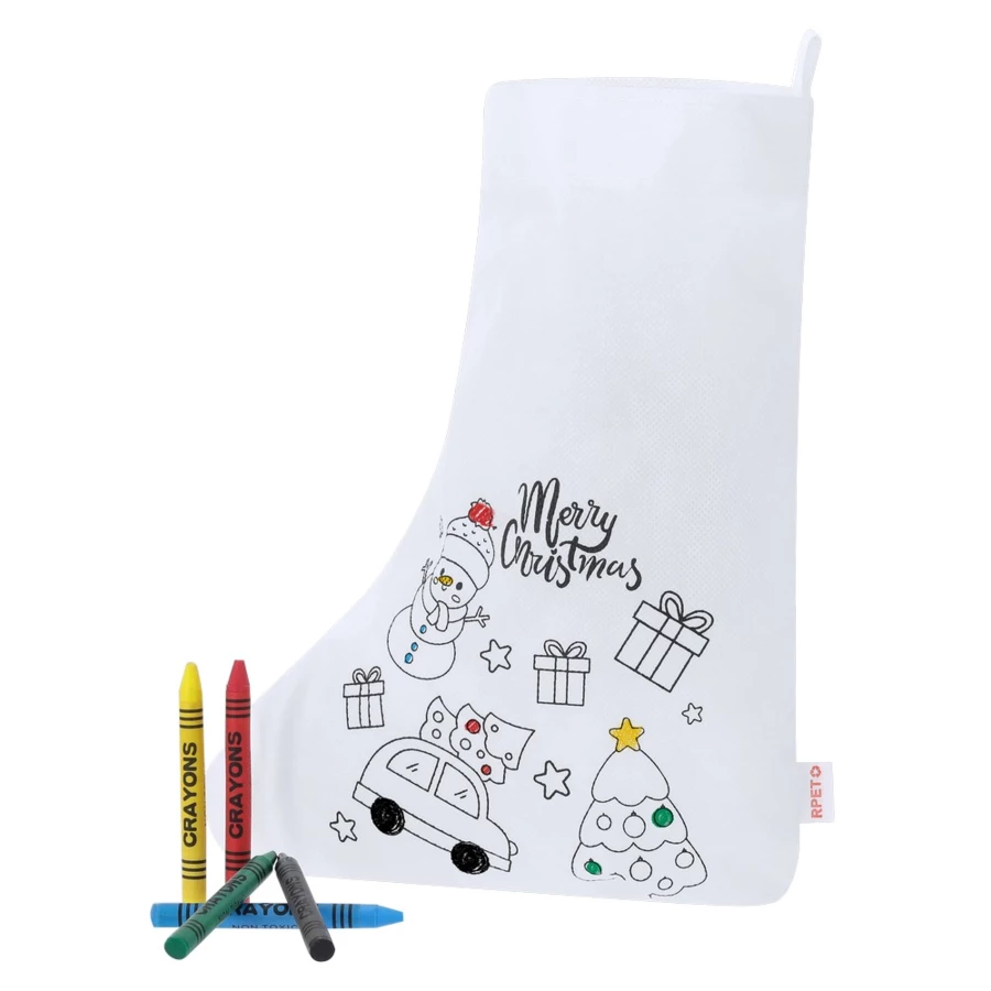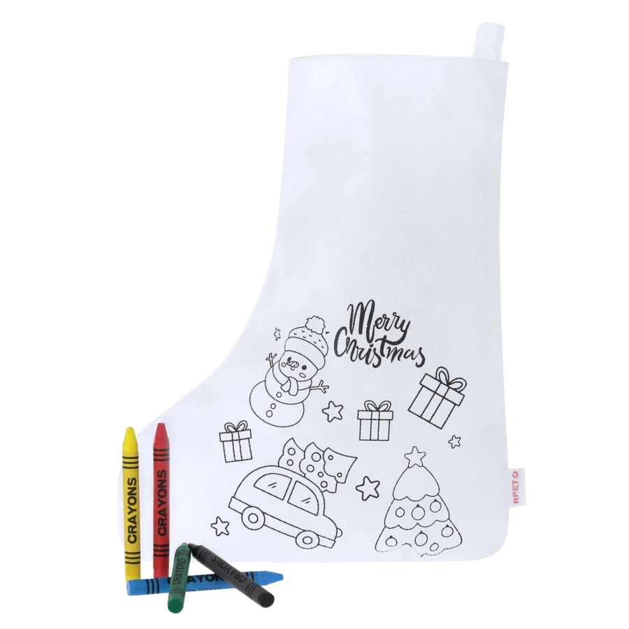 Skarpeta świąteczna z kolorowanką z motywem świątecznym na froncie, 5 kredek świecowych w komplecie, posiada wstążkę do zawieszania, ikona RPET na metce, produkt wykonany z materiału non-woven RPET