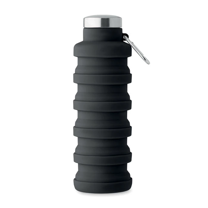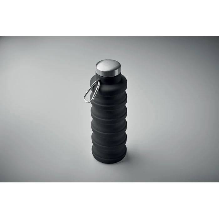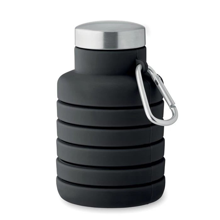 Składana silikonowa butelka z pokrywką ze stali nierdzewnej i z aluminiowym karabińczykiem. Karabińczyk nie jest przeznaczony do wspinaczki (nie do użytku profesjonalnego). Pojemność: 500 ml.