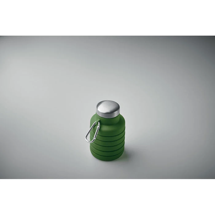 Składana silikonowa butelka z pokrywką ze stali nierdzewnej i z aluminiowym karabińczykiem. Karabińczyk nie jest przeznaczony do wspinaczki (nie do użytku profesjonalnego). Pojemność: 500 ml.