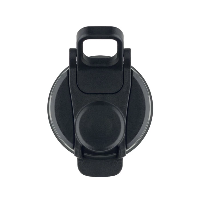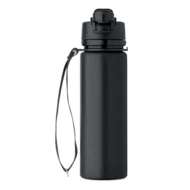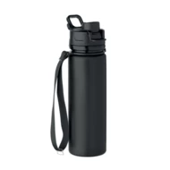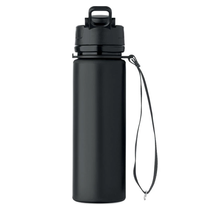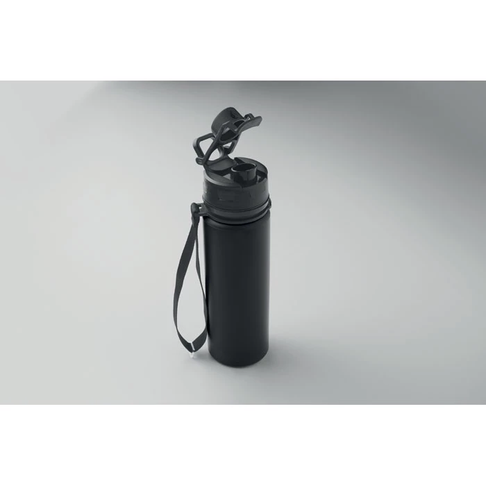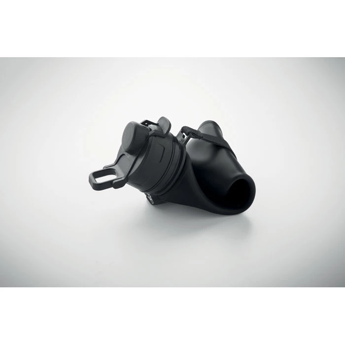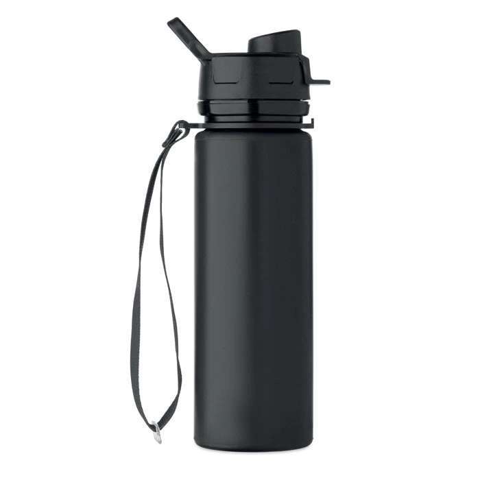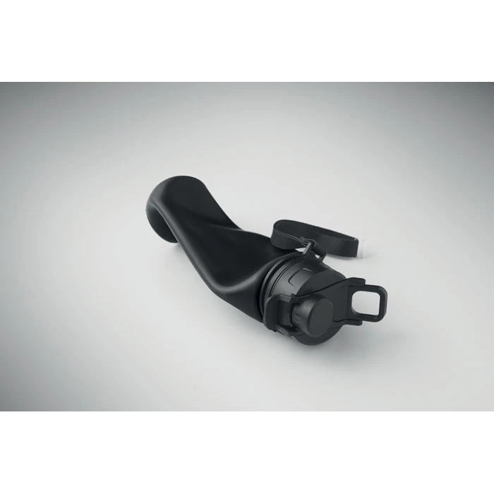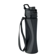 Składana silikonowa butelka sportowa z pokrywką z PP, uchwytem, poliestrowym paskiem i przezroczystą klamrą do zabezpieczenia po złożeniu. Nie przecieka. Pojemność: 500 ml.