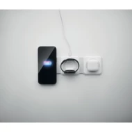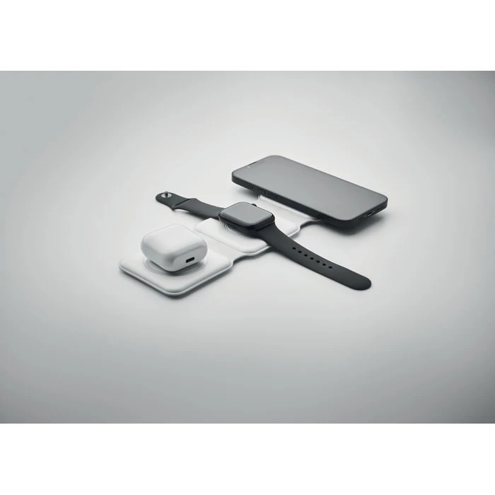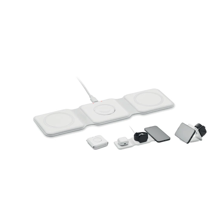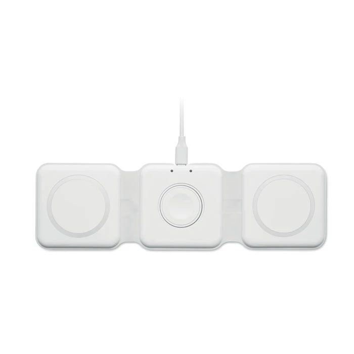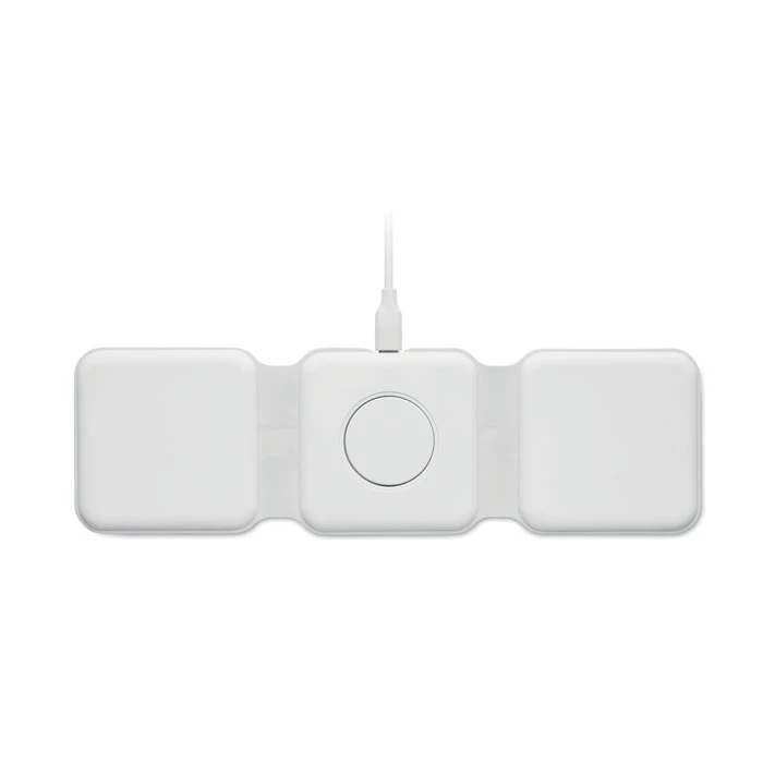 Składana stacja ładująca 3 w 1 z ABS. Posiada 3 punkty ładowania bezprzewodowego (15W). Wejście: 2 w 1 Type-C i Type-A.