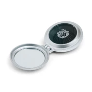 Składane lusterko i szczotka do włosów w plastikowym etui. Srebrne wykończenie.