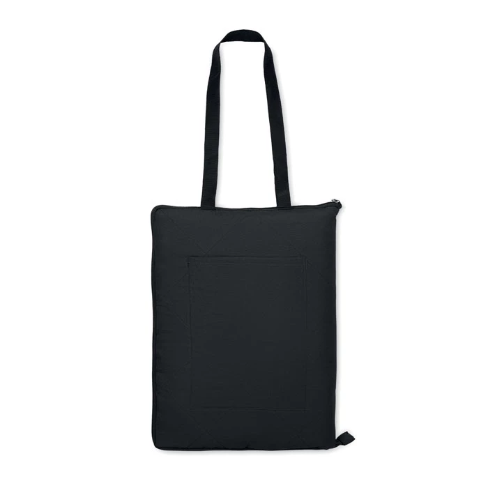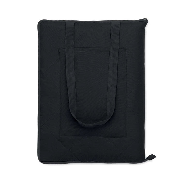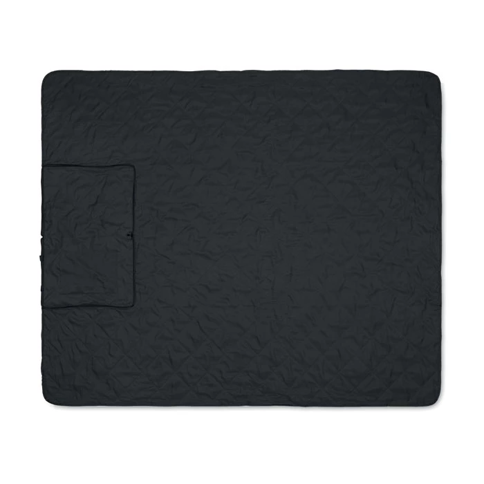 Składany pikowany koc piknikowy z plastikową powłoką PEVA na odwrocie. Składany do wygodnej torby z regulowanym paskiem na ramię. Zawiera dużą przednią kieszeń.