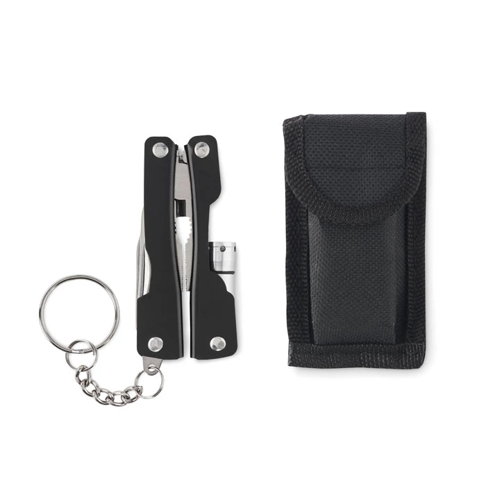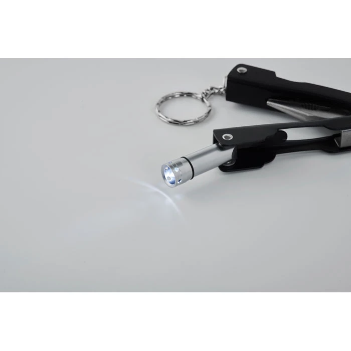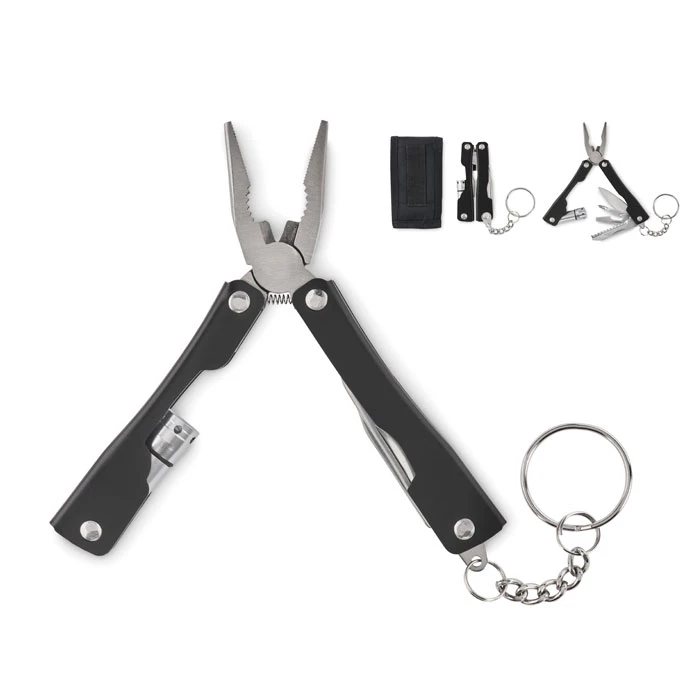 Składany nóż wielofunkcyjny z latarką ze stali nierdzewnej. Zawiera 10 różnych narzędzi oraz etui z poliestru 600D. Zawiera 3 baterie guzikowe AG3.