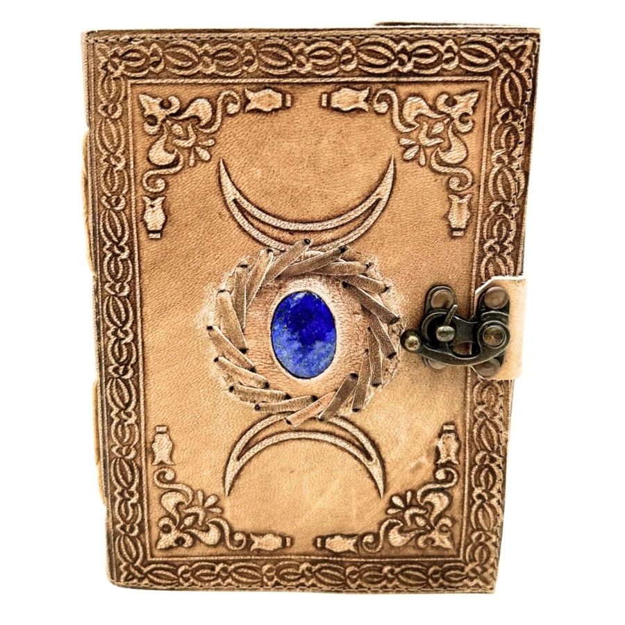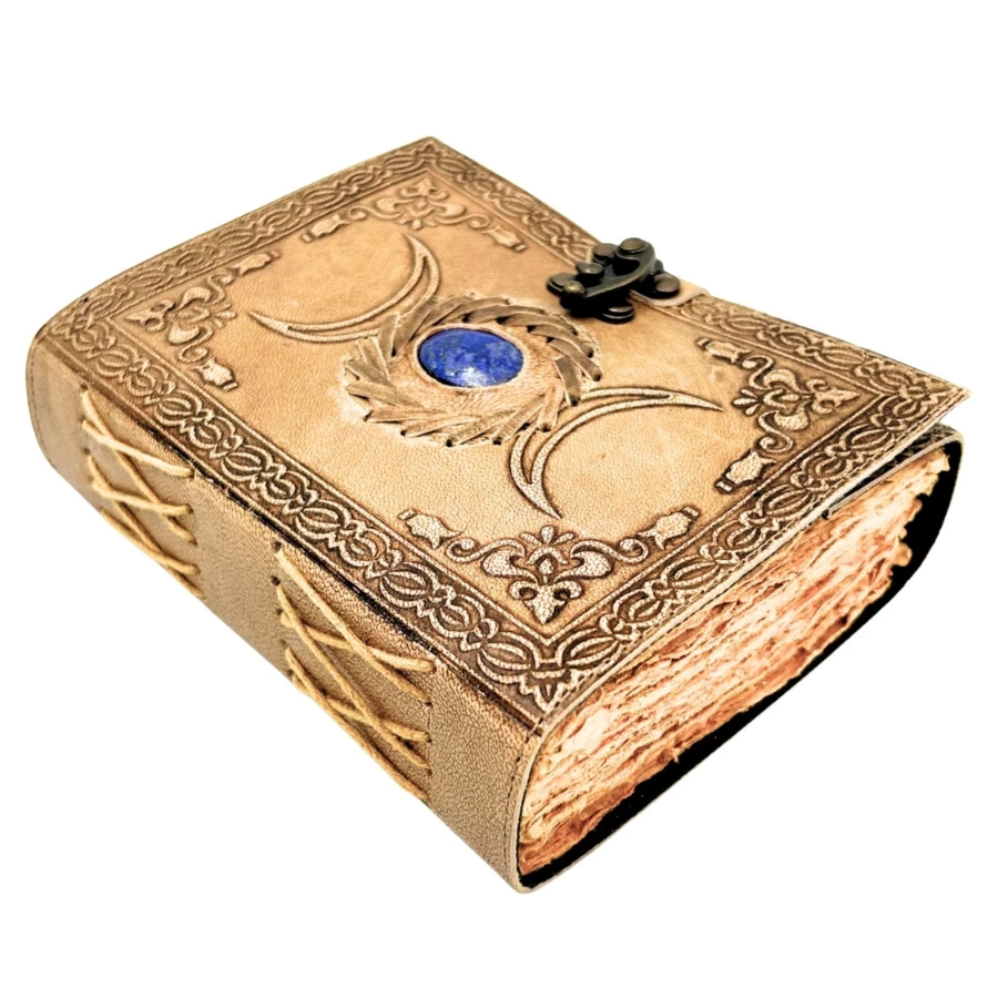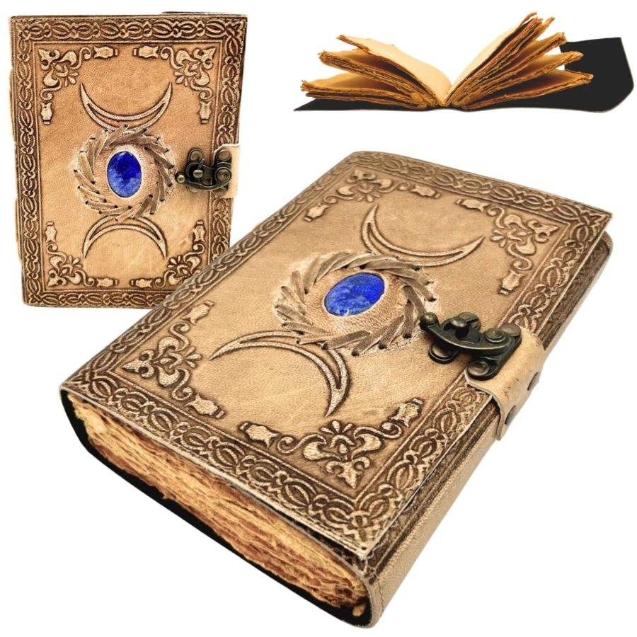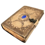 Wyjątkowy notatnik w stylu retro, inspirowany dawnymi księgami astrologów i alchemików. Wykonany z naturalnej skóry bawolej, z bogato zdobioną okładką i centralnie osadzonym dekoracyjnym niebieskim kamieniem, który nadaje całości mistycznego charakteru.