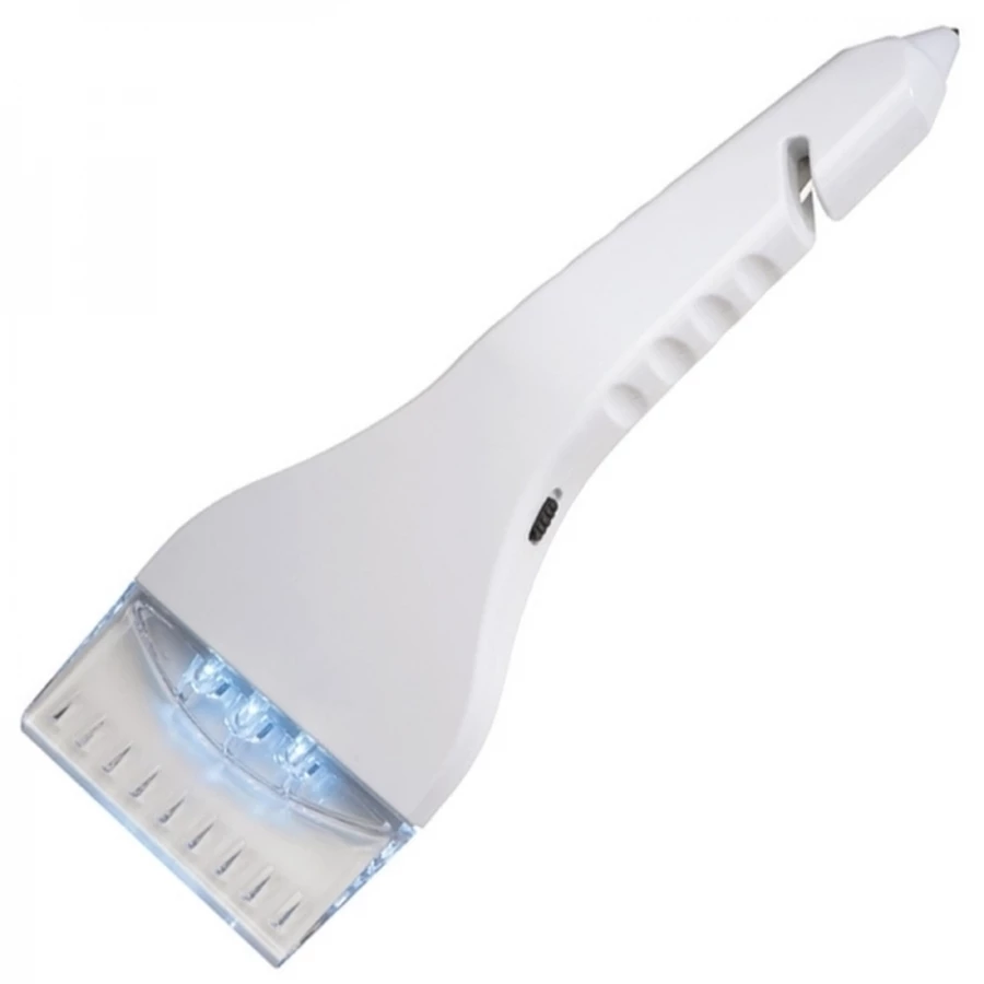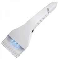 Samochodowa skrobaczka do szyb z trzema ledami, przecinarką i młotkiem. Materiały użyte do produkcji: ABS, PS, stal. Produkt zawiera 4 baterie coin cell.