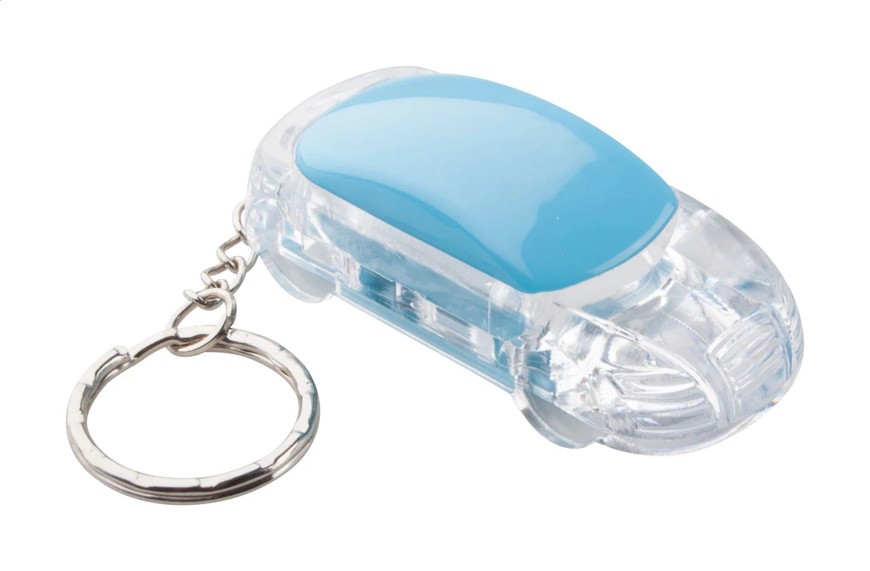 Brelok w kształcie samochodu z diodą LED i metalowym kółkiem. W zestawie z bateriami.