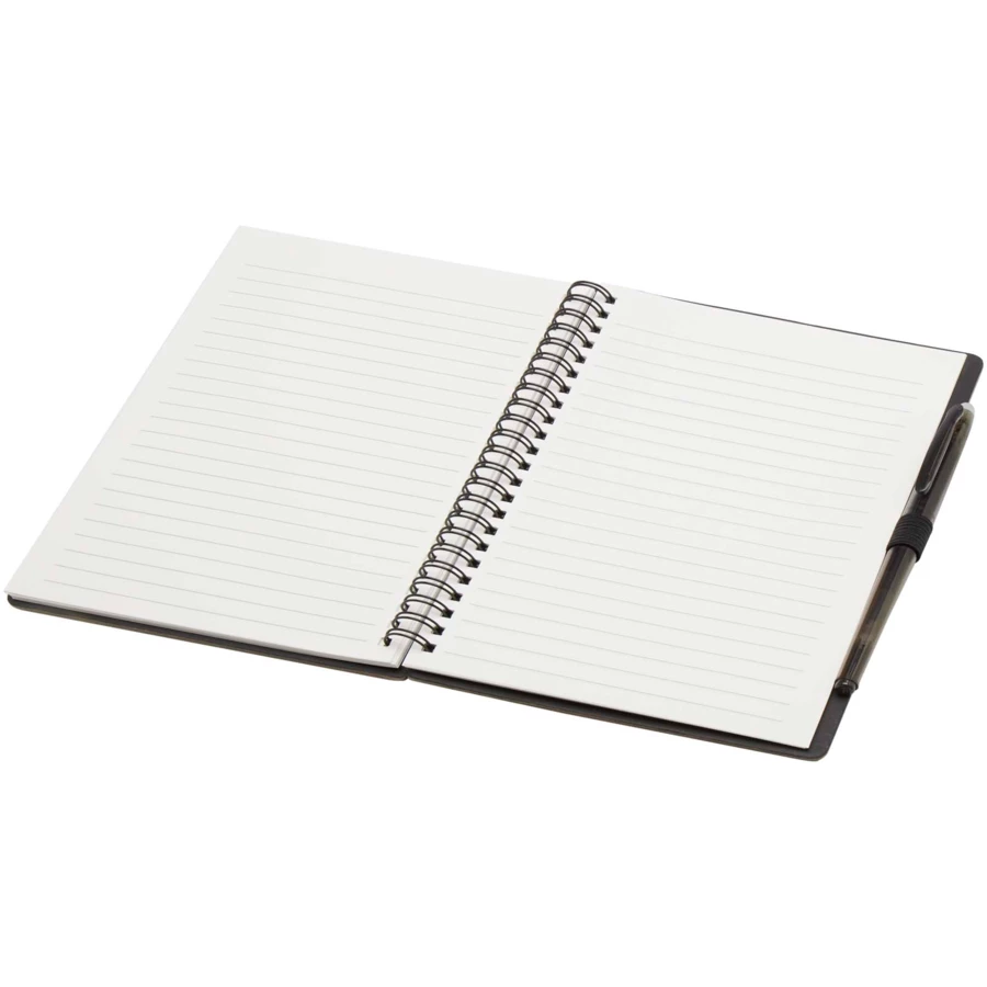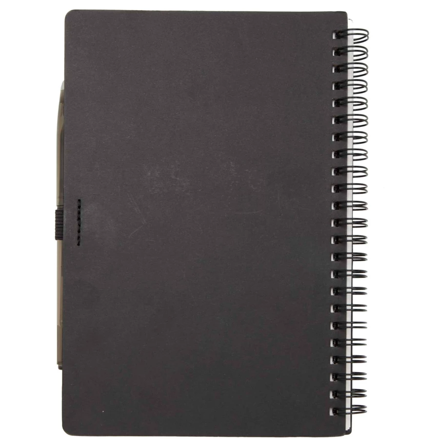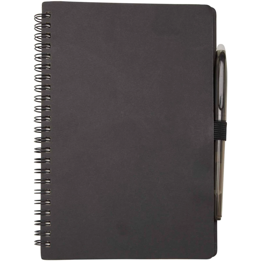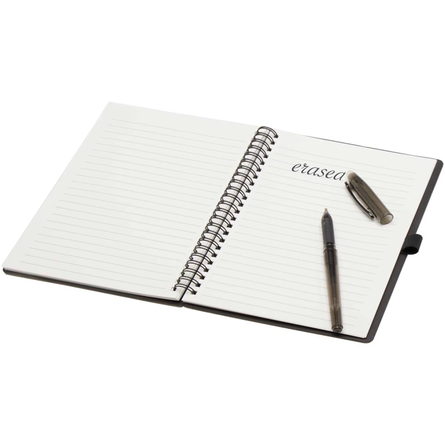 Zestaw składający się z notatnika wielokrotnego użytku z papieru z kamienia z miękką okładką i długopisu. Notes ma okładkę wykonaną z kartonu, zaokrąglone rogi oraz 32 kartki papieru w linie o gramaturze 120 g/m². Do wytworzenia papieru z kamienia nie są wykorzystywane drzewa, a proces produkcji zużywa mniej energii w porównaniu z papierem makulaturowym lub nowym papierem celulozowym. Z tyłu znajduje się kieszeń na czarną ściereczkę do wycierania (w zestawie). Zmazywalny długopis wykonany z plastiku z recyklingu ma przezroczysty korpus, białą gumkę na górze i kolorowy uchwyt. Kolor tuszu: Czarny. Żywotność: 250 metrów. Rozmiar stalówki: 0,7 mm.