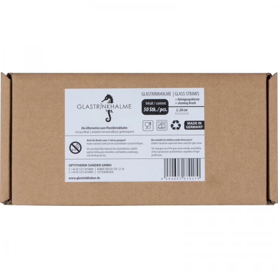Wielorazowa rurka do picia o długości 20 cm ze szkła hartowanego. Cena za jedną sztukę. Pakowana w zestawie 50 sztuk ze szczoteczką do czyszczenia. Można myć w zmywarce.