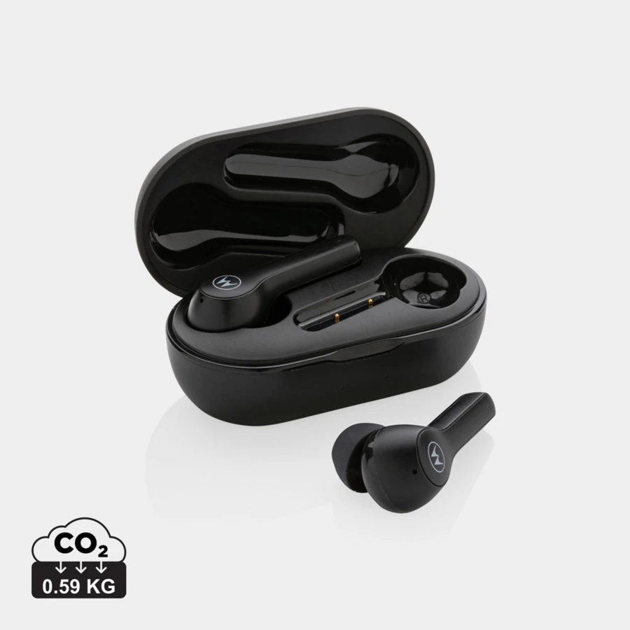 Słuchawki bezprzewodowe Motorola TWS BT2.0, ergonomiczny kształt, panel dotykowy, wbudowany mikrofon, kompatybilne z asystentami głosowymi (Siri®, asystent Google™), do 6 godzin odtwarzania na jednym ładowaniu, ślad węglowy produktu: 0,59 kg CO2