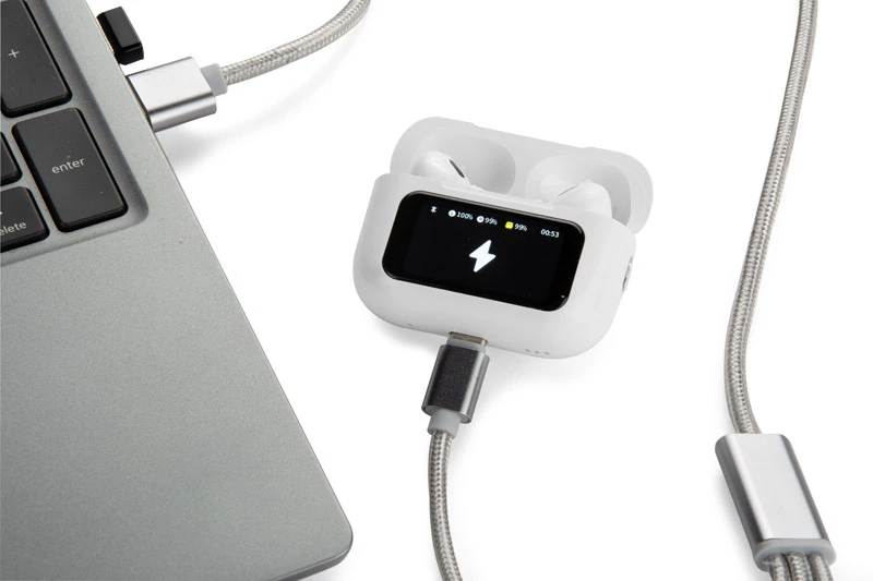 Słuchawki bezprzewodowe SENSIFY o nowoczesny gadżet premium, który łączy funkcjonalność słuchawek dousznych z zaawansowanym etui wyposażonym w kolorowy, dotykowy wyświetlacz. Pozwala on na sterowanie głośnością, aktywację redukcji hałasu (ANC/ENC), przełączanie w tryb dźwięku otoczenia (ambient) oraz podgląd poziomu naładowania. Słuchawki zapewniają do 4 godzin pracy, a etui o pojemności 300 mAh umożliwia ich wielokrotne ładowanie. Urządzenie łączy się ze smartfonem przez Bluetooth i obsługuje sterowanie dotykowe. Produkt zapakowany jest w estetyczne, minimalistyczne pudełko w stylu premium. Ładowanie odbywa się przez USB-C (kabel nie jest dołączony do zestawu).