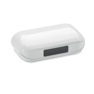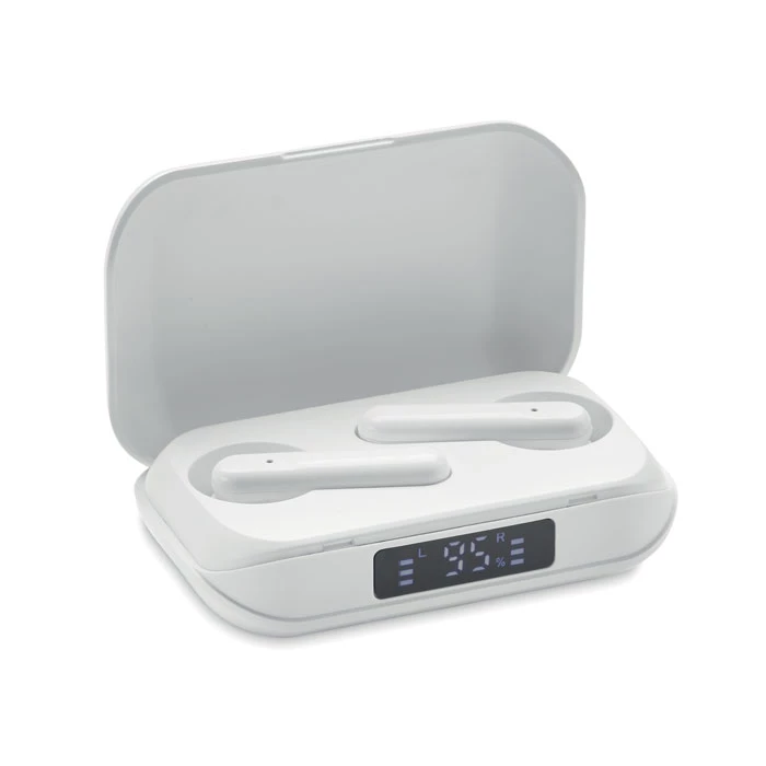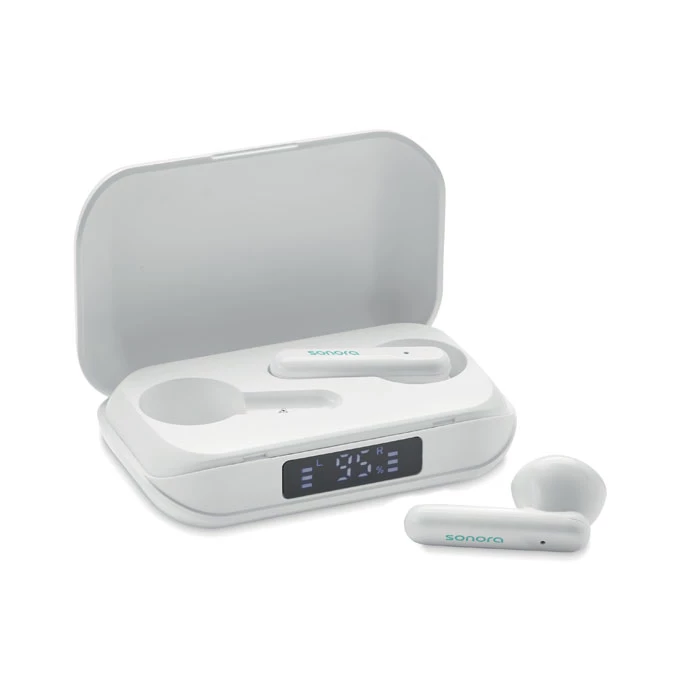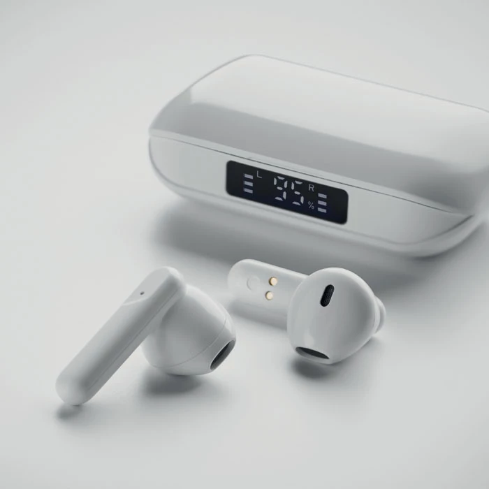 Bezprzewodowe, stereofoniczne słuchawki douszne z ABS True Wireless Stereo (TWS) 5.3 z mikrofonem i wbudowanym akumulatorem 30 mAh. czas odtwarzania ok. 3 godziny. Posiada wyświetlacz LCD poziomu naładowania. Automatyczne parowanie. W zestawie kabel do ładowania typu C oraz stacja ładująca o pojemności 250 mAh.