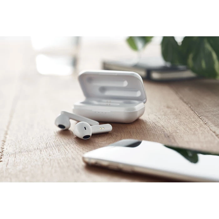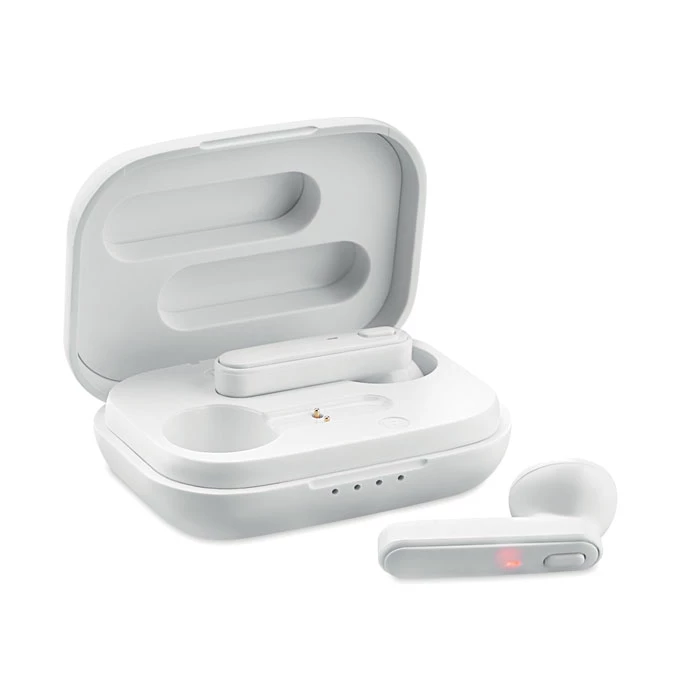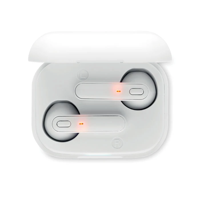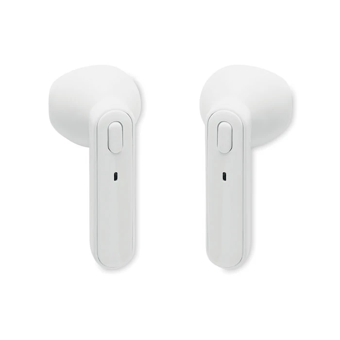 Zestaw 2 słuchawek True Wireless Stereo (TWS) 5.3 z mikrofonem i wbudowanym akumulatorem 30 mAh. Czas odtwarzania ok. 3 godziny. Automatyczne parowanie. W zestawie kabel do ładowania micro USB i stacja ładująca 185 mAh. Wykonane z recyklingowanego tworzywa ABS.