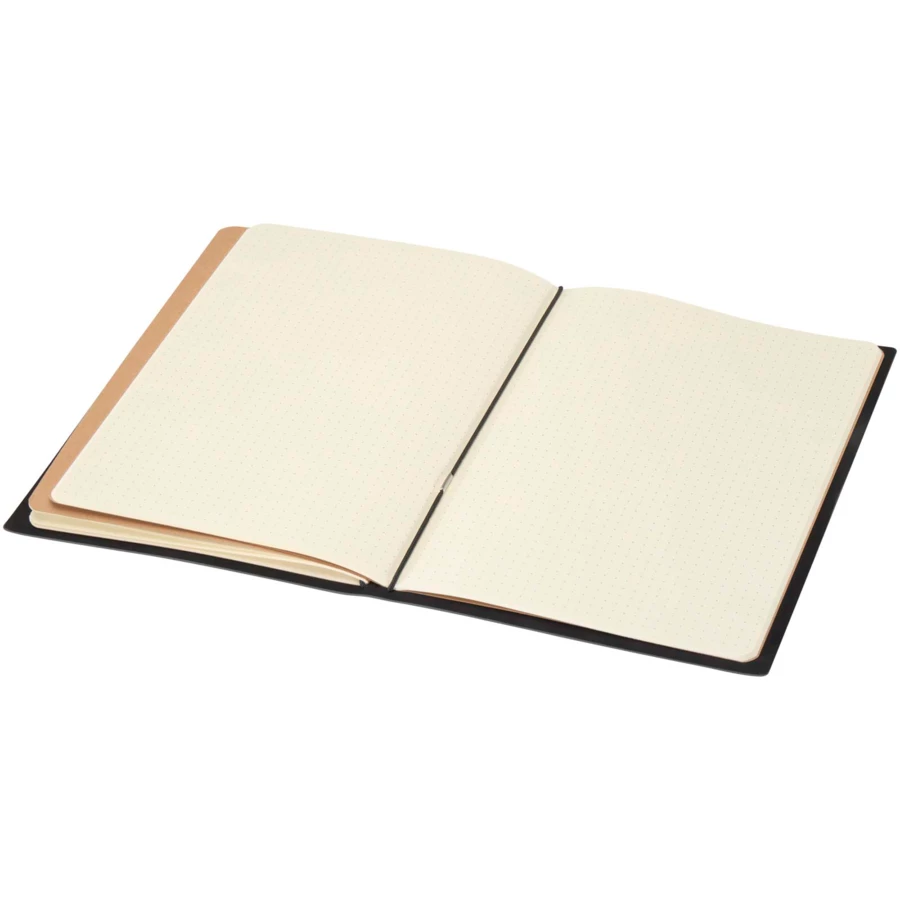 Notatnik A5 Slyk z wymiennymi wkładami ma okładkę z tworzyw sztucznych pochodzących z recyklingu z elastycznym zamknięciem, które bezpiecznie utrzymuje wewnątrz dwa notatniki — jeden w kropki i jeden w linie. Każdy wkład zawiera 32 kremowe arkusze z papieru o gramaturze 70 g/m², z zaokrąglonymi rogami i widocznymi przeszyciami na grzbiecie, przypominającymi produkt wykonany ręcznie. Okładki wkładów wykonane są z tektury. Wkłady do notesu są dostępne osobno w różnych wersjach: w tym w kropki, w układzie planistycznym i w linie.