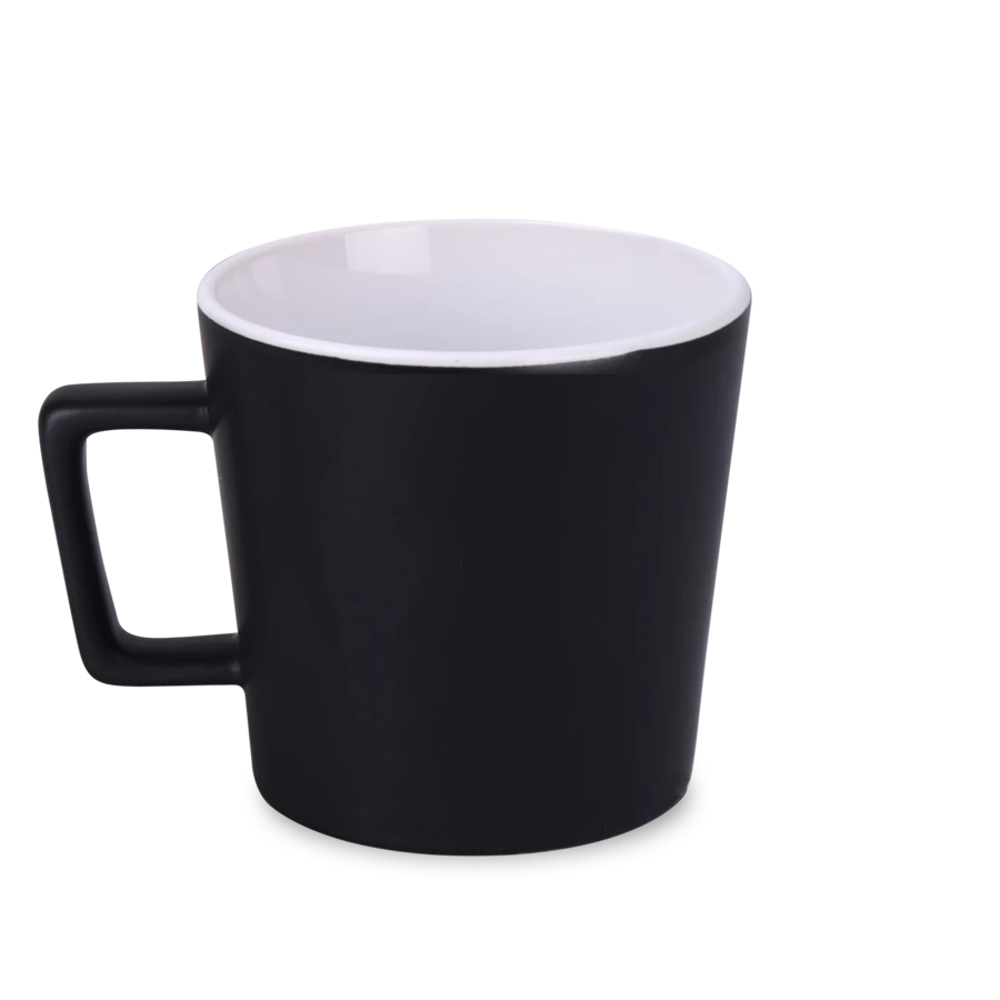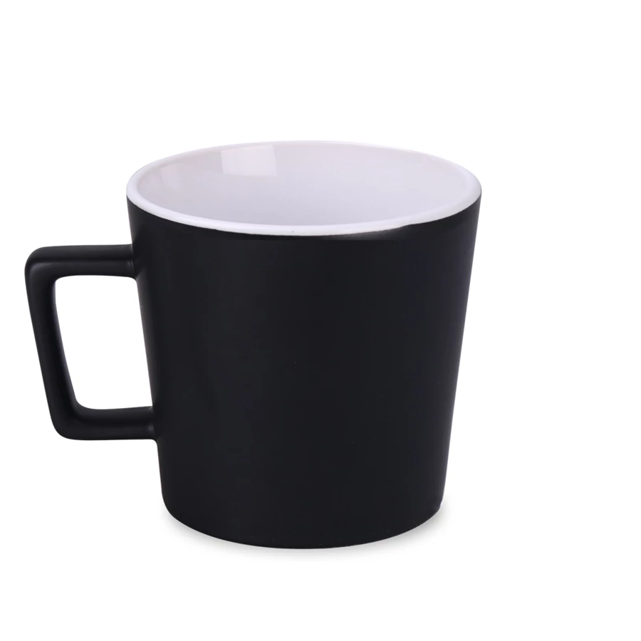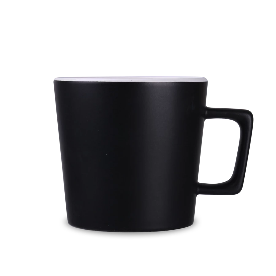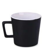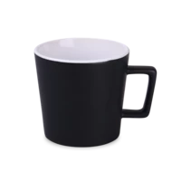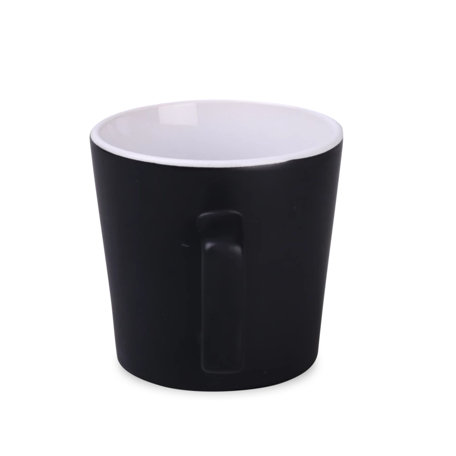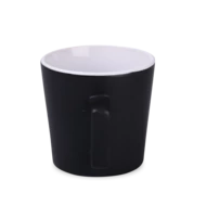 Nowoczesny kubek z czarną matową powierzchnią. Posiada ucho o ciekawym, designerskim kształcie. Posiada wnętrze w kilku kolorach.