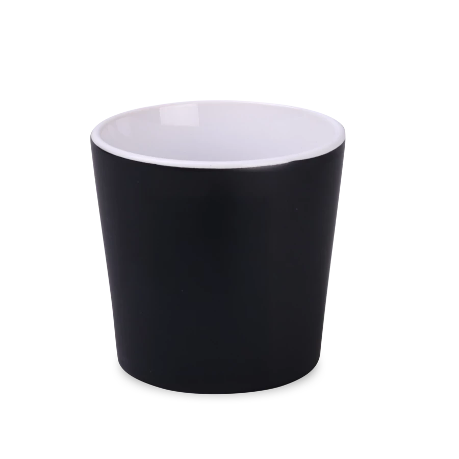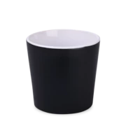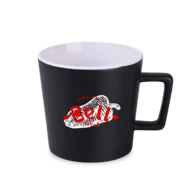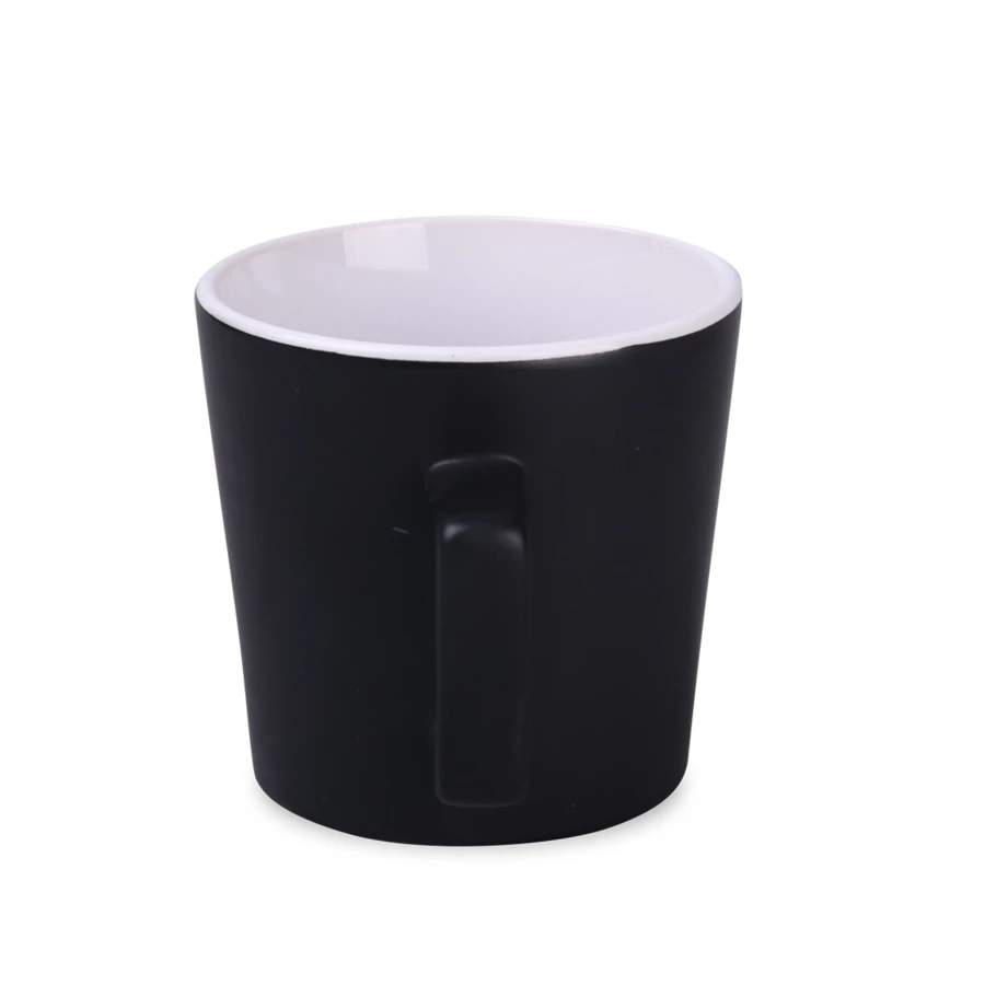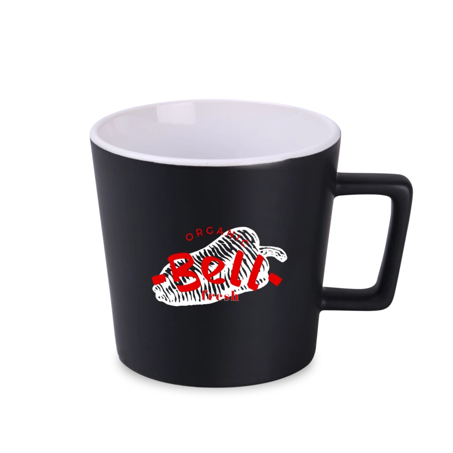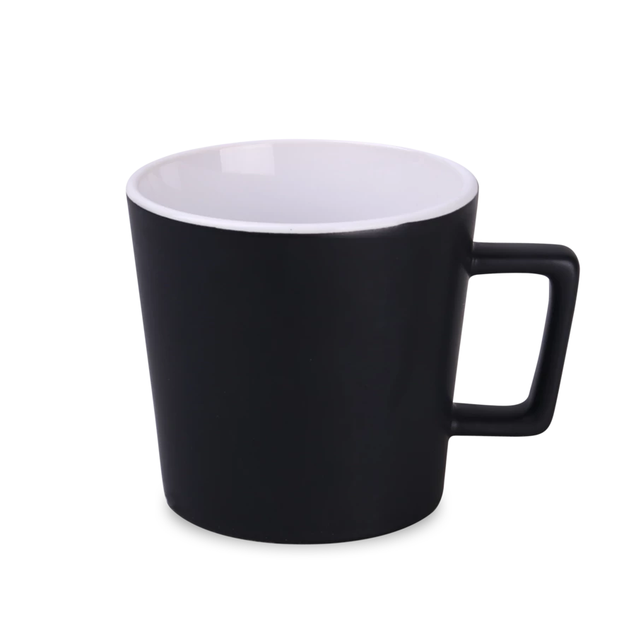 Nowoczesny kubek z czarną matową powierzchnią. Posiada ucho o ciekawym, designerskim kształcie. Posiada wnętrze w kilku kolorach.
