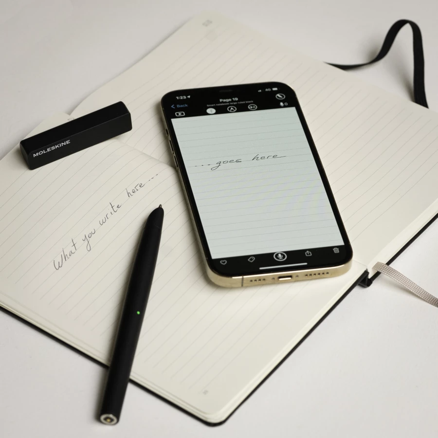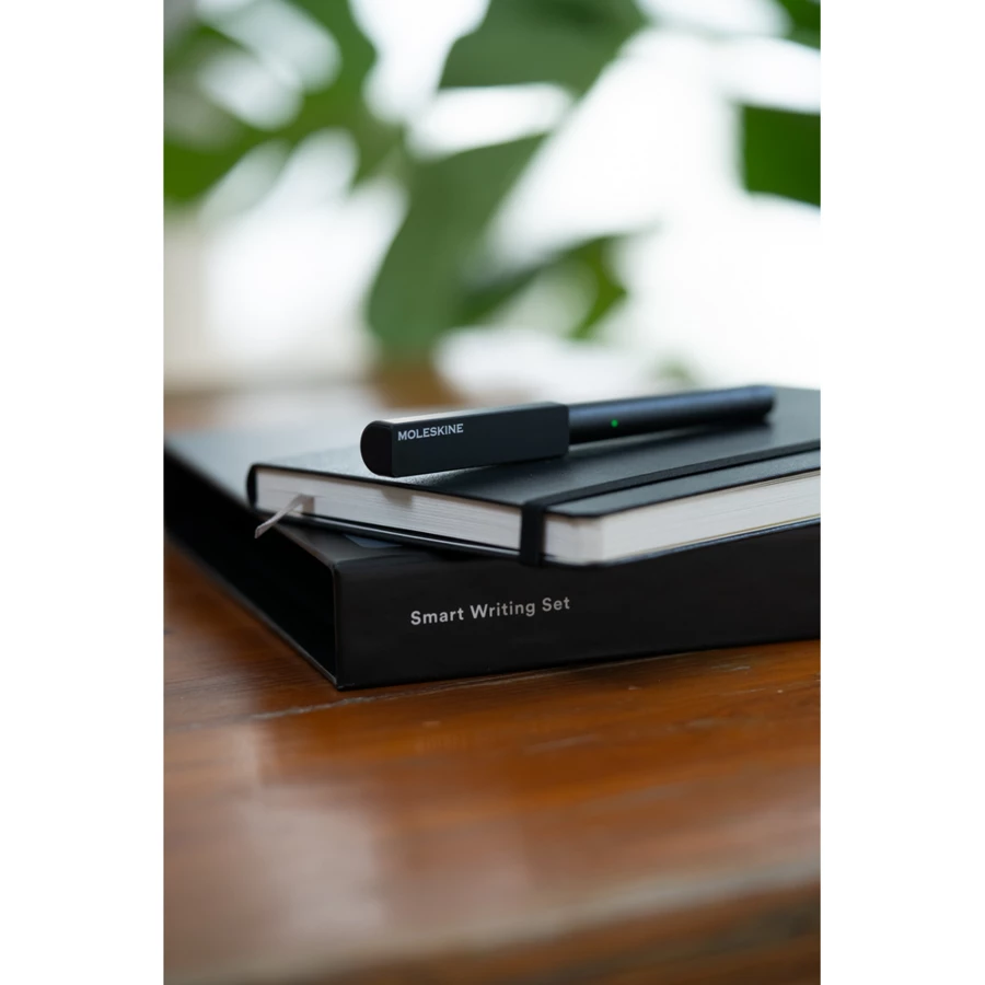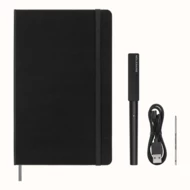 Zestaw MOLESKINE Smart Writing Set 3 przenosi odręcznie zrobione notatki lub szkice na urządzenia mobilne za pomocą darmowej aplikacji, w skład zestawu wchodzi: długopis cyfrowy Smart Pen, specjalny notatnik w linie MOLESKINE Smart Notebook (ok. A5, large, 176 stron), kabel do ładowania oraz dodatkowy wkład