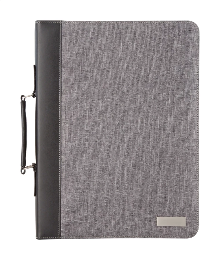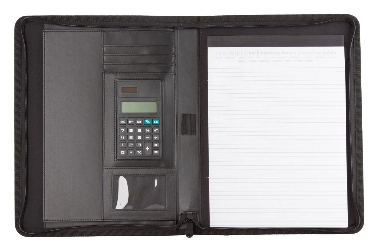Zapinana teczka na dokumenty z rączką, A4, pokryta tkaniną lnianą i skórą PU. Zawiera notatnik z 20 kartkami w linie, kalkulator na baterie słoneczne i metalową blaszkę.