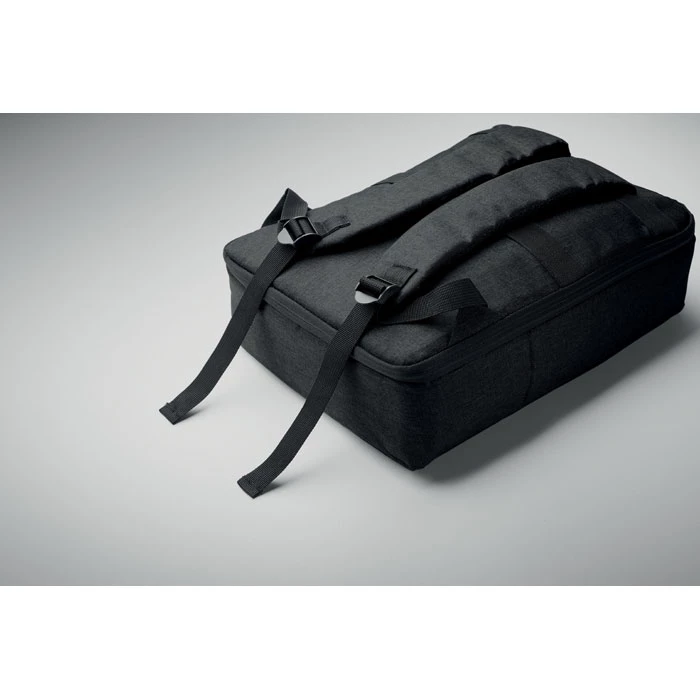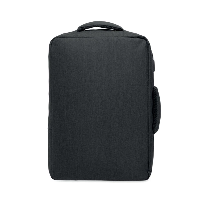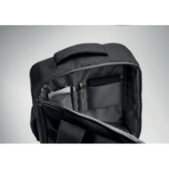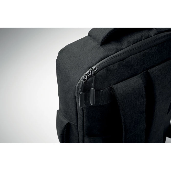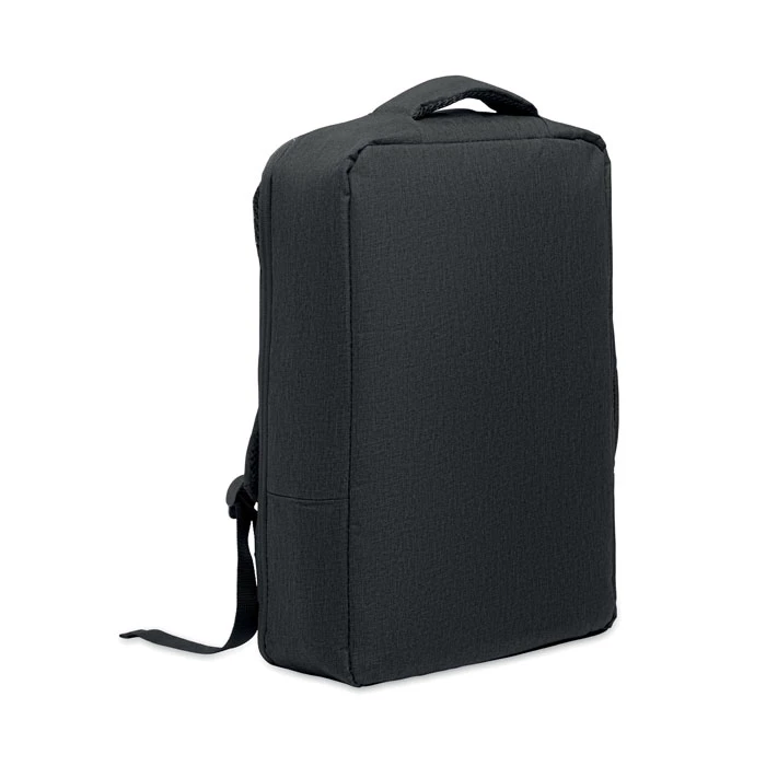 15-calowy plecak na laptop z 300D RPET z otworem 180 stopni i podszewką 210D RPET. Zawiera przegrodę na laptopa, 2 wewnętrzne kieszenie wsuwane, 2 wewnętrzne kieszenie na długopisy i 2 wyściełane uchwyty do przenoszenia, miękko wyściełany tył i szelki, pasek na walizkę.