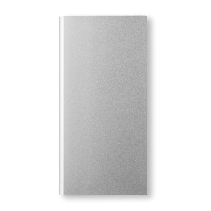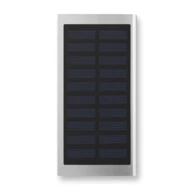 Power bank 8000 mAh z aluminium z recyklingu i panelem słonecznym. Pojemność do smartfonów, prąd wyjściowy DC5V/1A i DC5V/2A. Zawiera lampkę kontrolną i kabel USB z wtyczką micro USB.