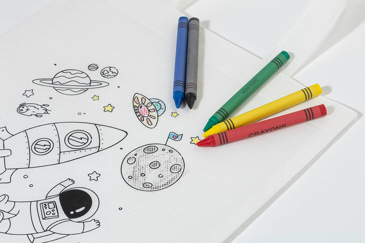 Kolorowanka w formie mini torby na zakupy z włókniny RPET w zestawie z 5 kredkami.