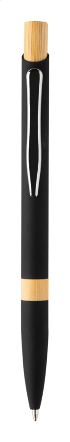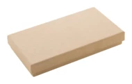Zestaw upominkowy składający się z 2 części w pudełku prezentowym z papieru kraft. Zawiera długopis z recyklingowanego aluminium z detalami z bambusa, gumowane wykończenie i niebieski wkład oraz brelok z bambusa z gumowaną płytką ze stali nierdzewnej z recyklingu. Oba przedmioty mają specjalną powłokę do grawerowania laserowego lustrzanego.