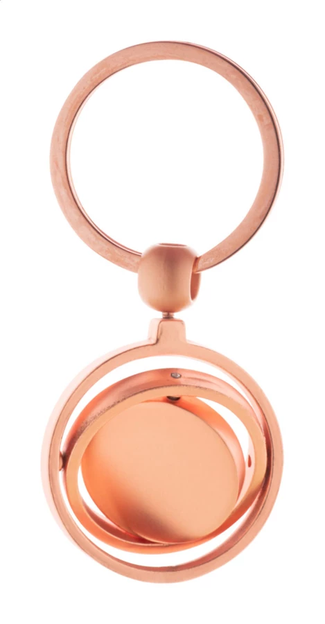Metalowy brelok do kluczy w złotym wykończeniu z obrotową częścią wewnętrzną. W pudełku z papieru kraft.