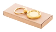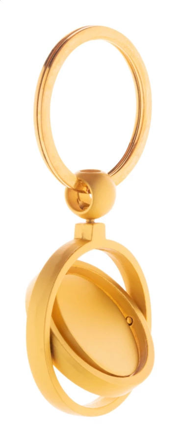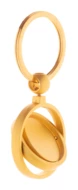 Metalowy brelok do kluczy w złotym wykończeniu z obrotową częścią wewnętrzną. W pudełku z papieru kraft.