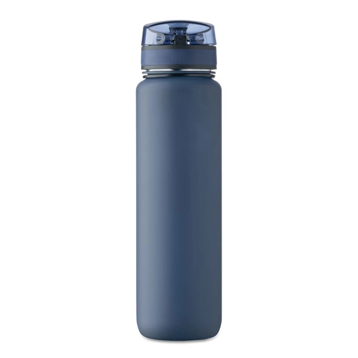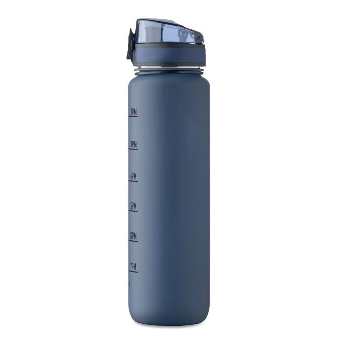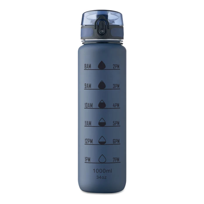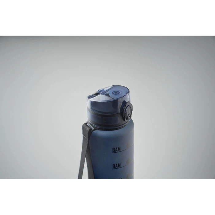 Sportowa butelka na wodę z RPET, motywujące oznaczenia czasu, otwierana jedną ręką klapka, blokada bezpieczeństwa i pasek do przenoszenia. Nie przecieka. Pojemność: 1 l.