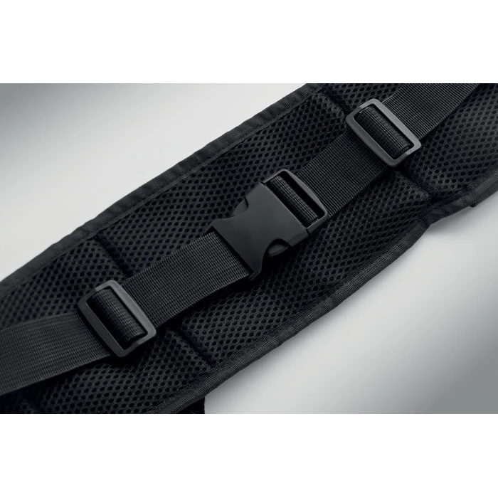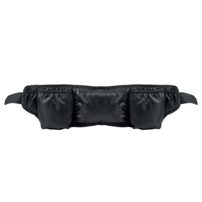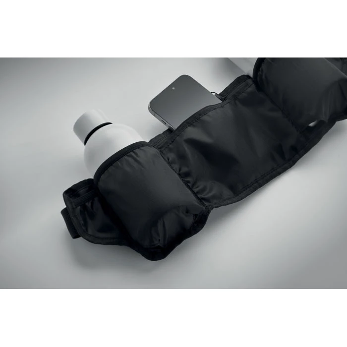 Sportowa saszetka do biegania i wędrówek wykonana z poliestru 420D RPET z siatkowym tyłem. Posiada dwie przegrody na butelki, centralną kieszeń na suwak i regulowany pasek. Lekka i wytrzymała.