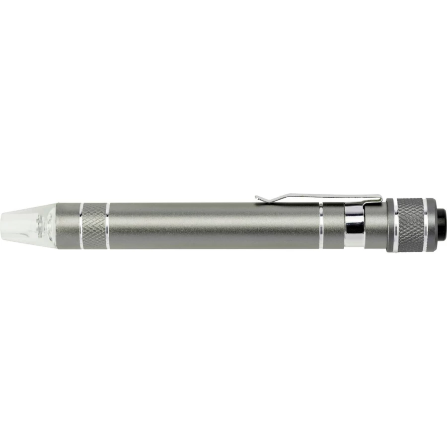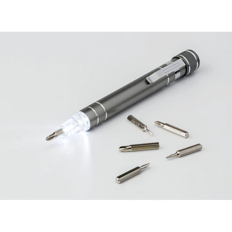 Śrubokręt w kształcie długopisu z lampką LED i końcówkami: 3 płaskie i 3 krzyżakowe