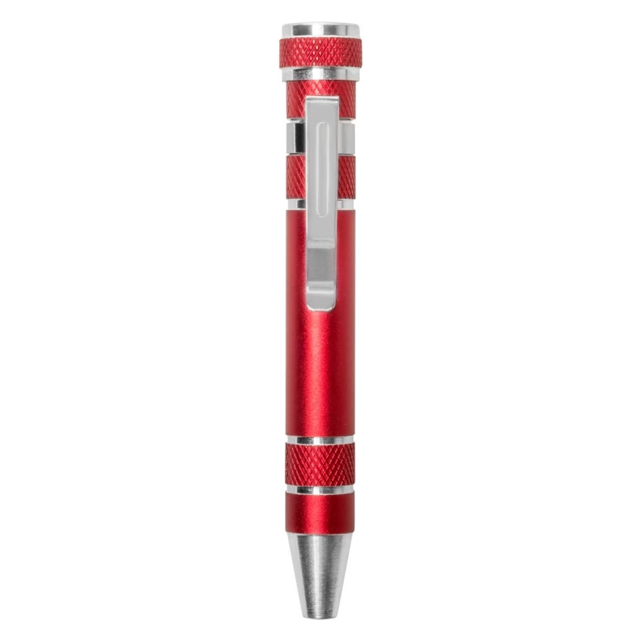 Śrubokręt w kształcie długopisu z 4 płaskimi i 4 krzyżakowymi końcówkami, posiada klip umożliwiający przypinanie, produkt wykonany z aluminium i stali