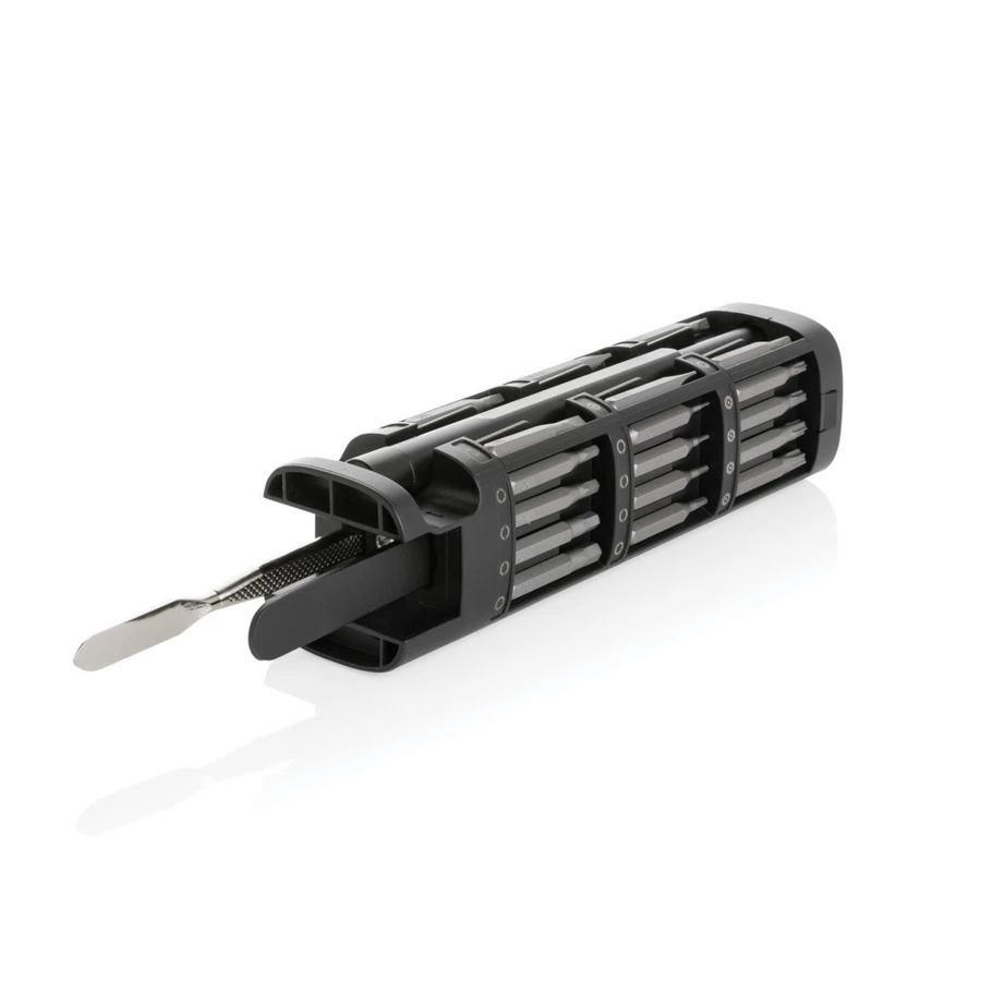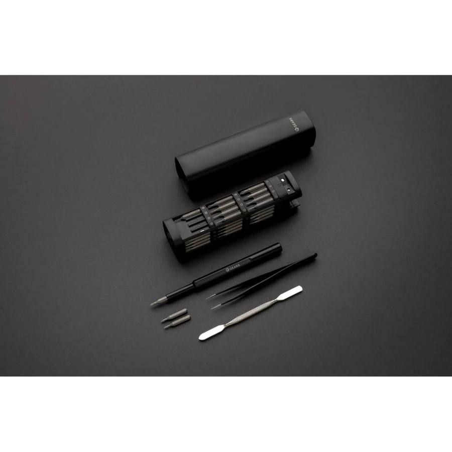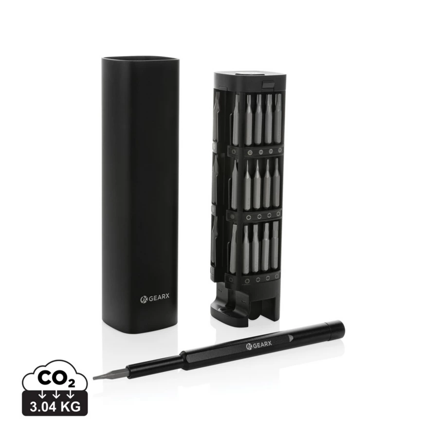 Śrubokręt, zestaw 56 końcówek w magnetycznym pudełku, etui wykonane z aluminium z recyklingu, całkowita zawartość materiałów z recyklingu obliczona na podstawie wagi całkowitej przedmiotu: 22%, ślad węglowy produktu: 2,5 kg CO2