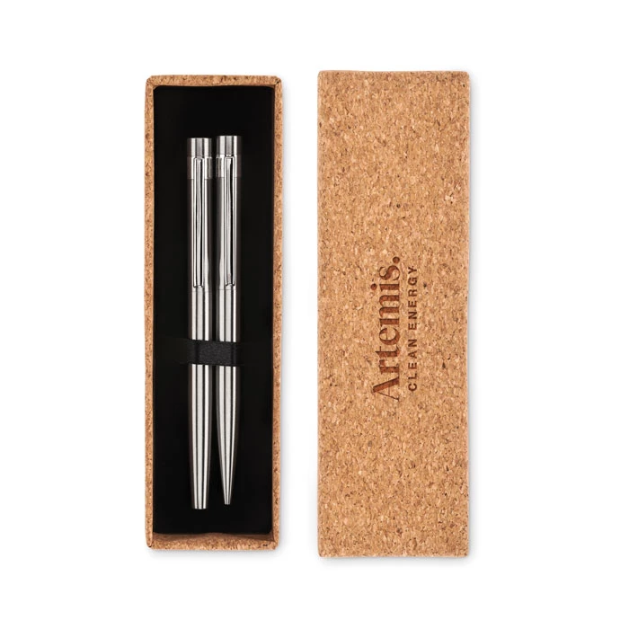 Zestaw piśmienniczy z recyklingowanej stali nierdzewnej. Długopis i pióro kulkowe. Pakowany w pudełko z korka. Tusz niebieski i czarny. Korek jest materiałem w 100% naturalnym. Ze względu na jego strukturę i porowatość powierzchni ostateczny wygląd nadruku na każdym artykule może się różnić.