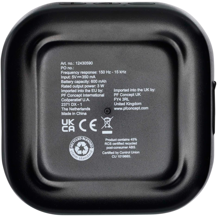 Głośnik Bluetooth® z certyfikatem RCS o mocy 3 W, odtwarzający muzykę, podcasty itp. z dowolnego urządzenia obsługującego technologię Bluetooth®, co czyni go idealnym towarzyszem na każdą okazję. Głośnik posiada wbudowane sterowanie muzyką oraz mikrofon do rozmów telefonicznych i spotkań online. Zapewnia nawet 3–4 godziny muzyki przy maksymalnej głośności. Czas ładowania wynosi 3 godziny. Bluetooth® 5.3 z zasięgiem roboczym wynoszącym około 10 metrów. Dostarczany z instrukcją obsługi i kablem ładującym USB-A do USB typu C o długości 30 cm oraz zapakowany w kartonowe pudełko ze zrównoważonych źródeł, pochodzące w 100% z recyklingu.