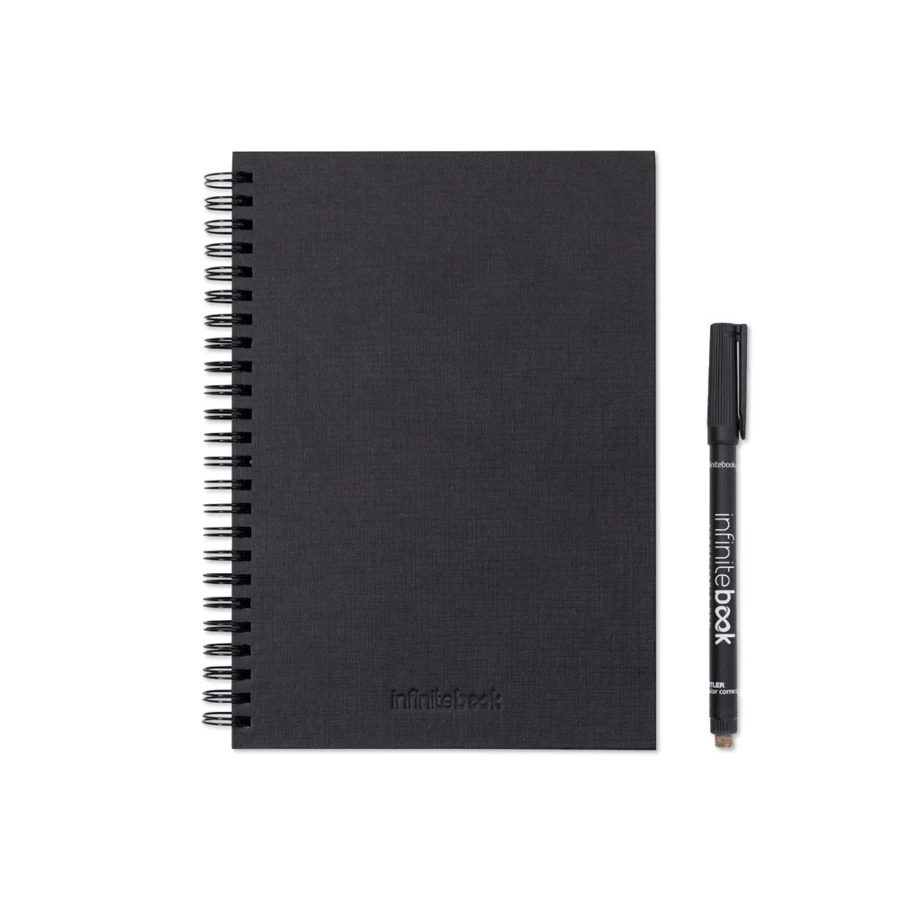 Zestaw startowy „Infinitebook – Planner Texture” A5 pozwala łatwo wymazać wszystko, co napiszesz, i zacząć od nowa tyle razy, ile chcesz. Zawiera on „Infinitebook” z twardą okładką i ringami, 1 zestaw do czyszczenia (pusta butelka z rozpylaczem, gąbka i 1 ściereczka), 1 marker i 1 uchwyt na długopis. Wnętrze „Infinitebook” składa się z 1 strony do zapisywania zadań, 5 tygodni z listą „rzeczy do zrobienia”, 3 miesięcznych planerów, 1 rocznego planera podzielonego na miesiące, 1 strony do zapisywania nawyków i 8 stron w kropki. Notatki można digitalizować. Wyprodukowano w Europie. Produkty są dostarczane w pudełku. 148 x 210 mm