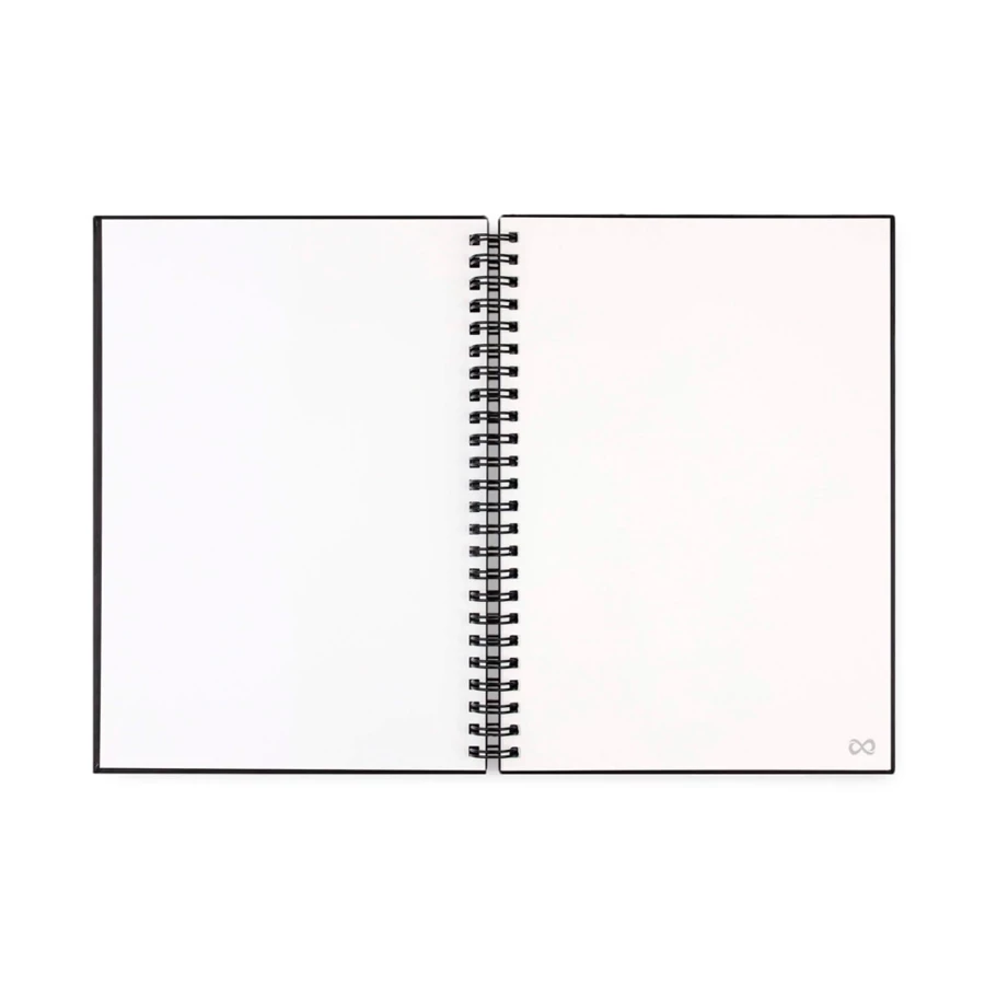 Zestaw startowy „Infinitebook” A5 pozwala łatwo wymazać wszystko, co zapisałeś i zacząć od nowa tak często, jak chcesz. Składa się z Infinitebooka z twardą okładką i pierścieniami, zestawu do czyszczenia (pusta butelka z rozpylaczem, gąbka i ściereczka), markera i uchwytu na marker. Podstawa Infinitebook składa się z 1 strony do zapisywania zadań i 35 zwykłych stron do robienia notatek. Notatki można skanować. Wyprodukowano w Europie. Produkty są dostarczane w pudełku. 148 x 210 mm | Pudełko: 225 x 175 x 46 mm