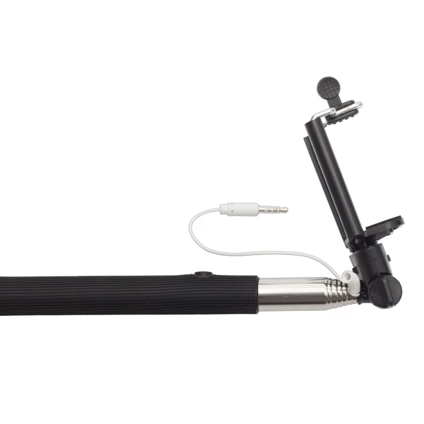 Stalowy uchwyt dostosowany do smartfonów o szerokości 55-80 mm. Zwolnienie migawki następuje za pomocą przycisku umieszczonego na rączce. Ruchoma głowica w zakresie 180 stopni. Dodatkowo wyposażony w śrubę statywową 1/4” umożliwiającą zamontowanie aparatu fotograficznego.