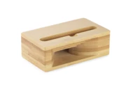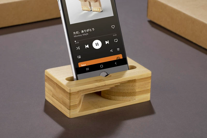 RESONA to bambusowy stojak na telefon pełniący jednocześnie funkcję wzmacniacza dźwięku. Jego wyprofilowany kształt sprawia, że dźwięk wydobywający się z telefonu umieszczonego w środku, jest głębszy i mocniejszy. Stojak zapakowany w brązowy kartonik z infografiką sugerującą jego działanie.