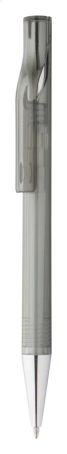 Plastikowy długopis w transparentnych kolorach, z chromowaną końcówką i niebieskim wkładem.