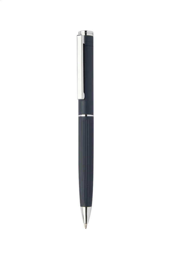 Elegancki, aluminiowy zestaw piśmnienniczy zawierający długopis i pióro kulkowe z teksturowanym korpusem w paski. W czarnym pudełku upominkowym z niebieskim wkładem.