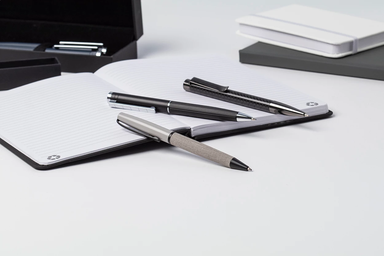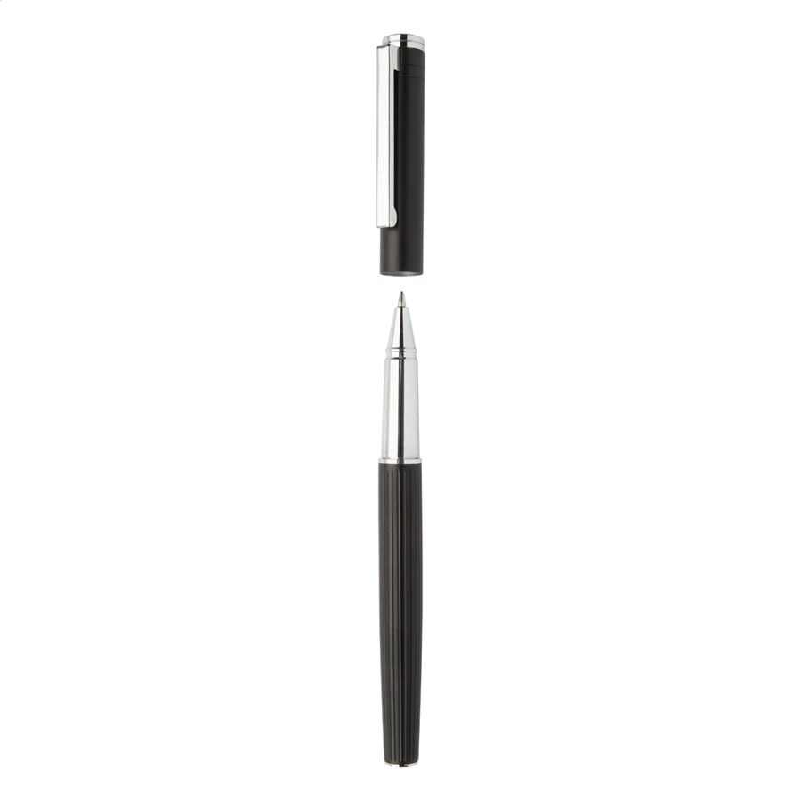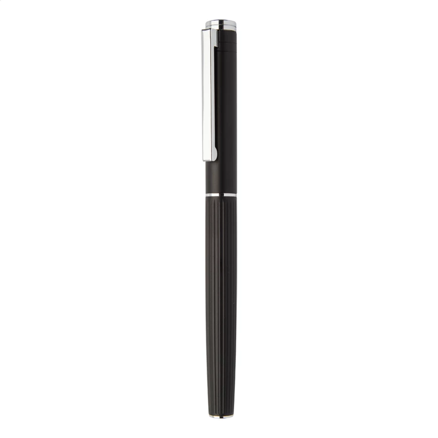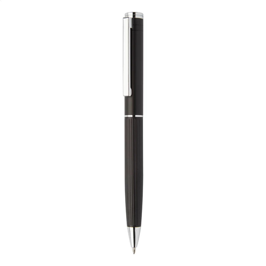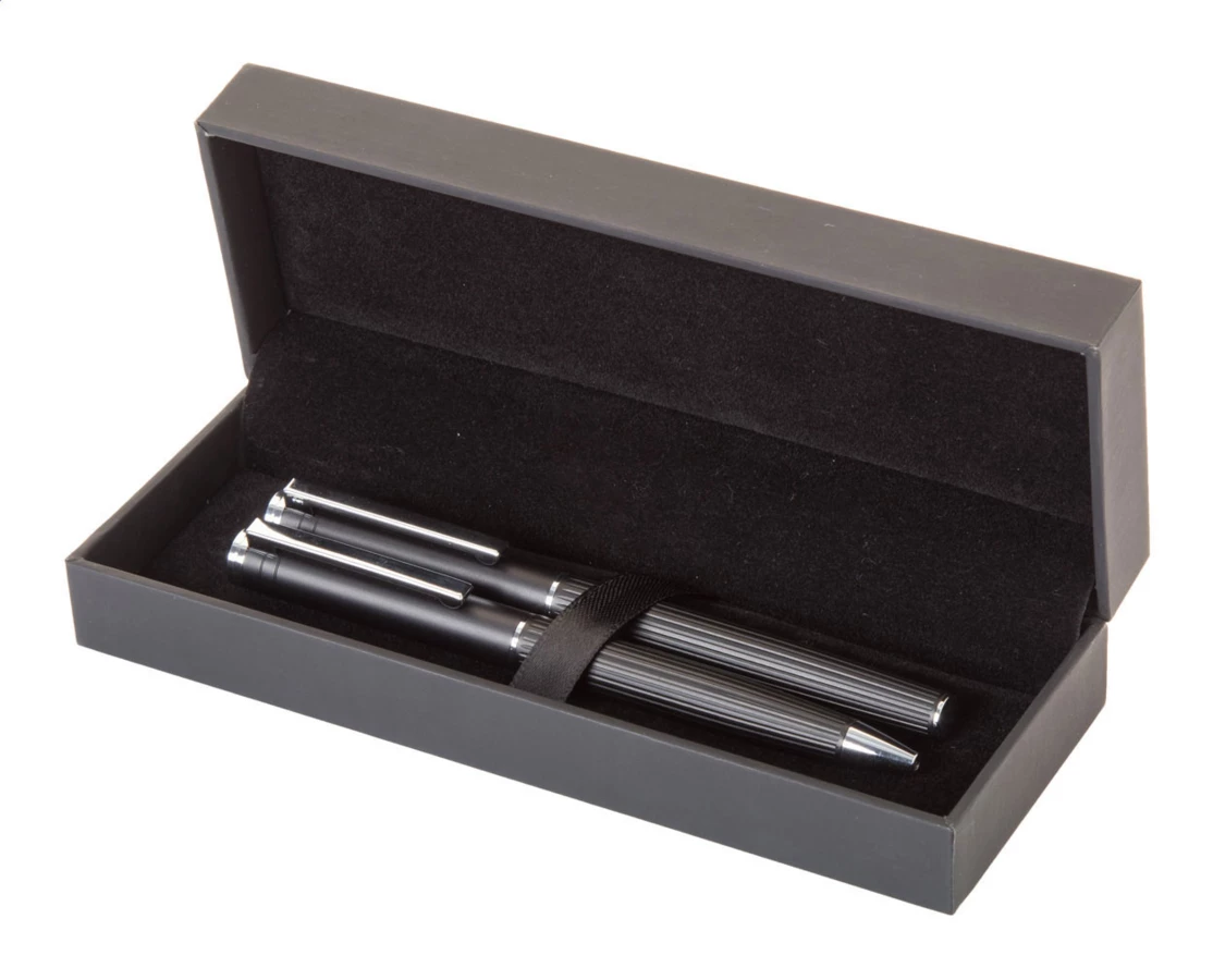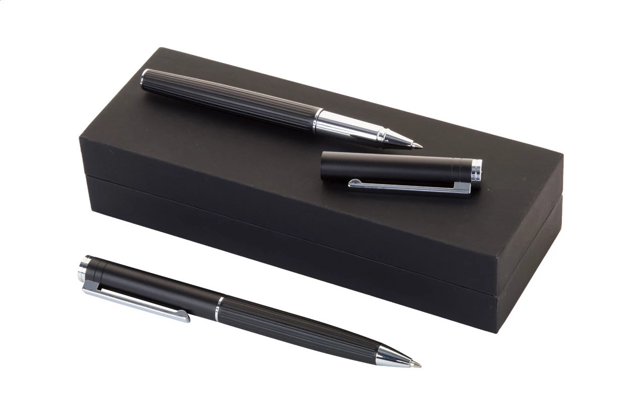 Elegancki, aluminiowy zestaw piśmnienniczy zawierający długopis i pióro kulkowe z teksturowanym korpusem w paski. W czarnym pudełku upominkowym z niebieskim wkładem.